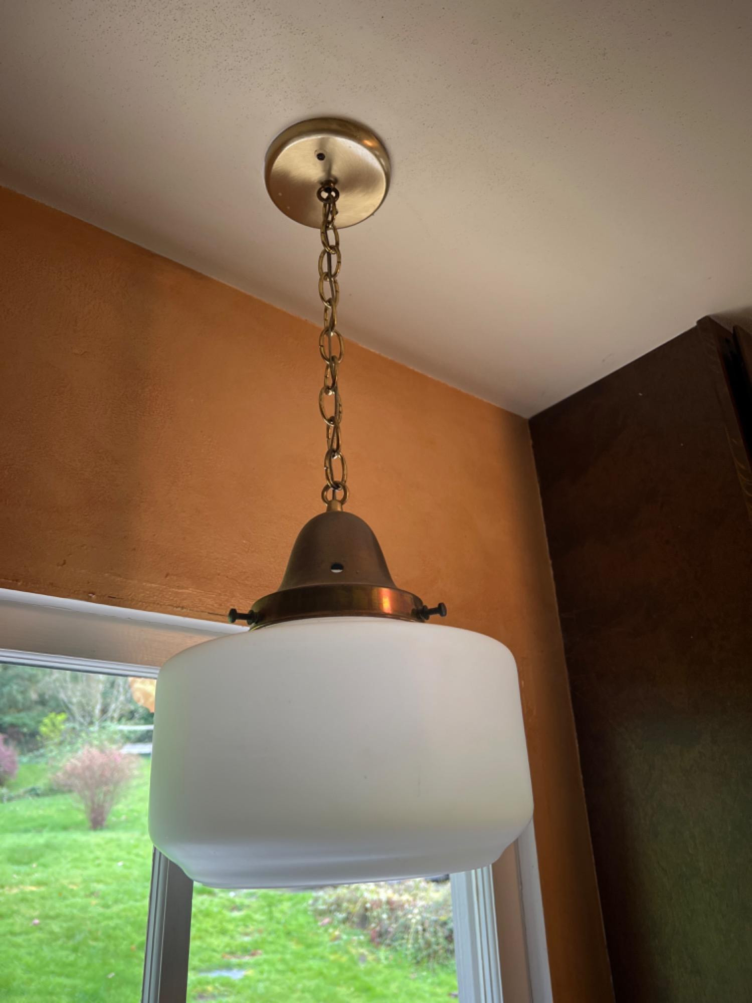 Vintage schoolhouse ceiling light with milk glass globe and brushed brass ceiling plate and chain. Globe is 10” t x 6” round and hangs 24.5” from ceiling. Buyer brings appropriate tools and electrical expertise to remove light.