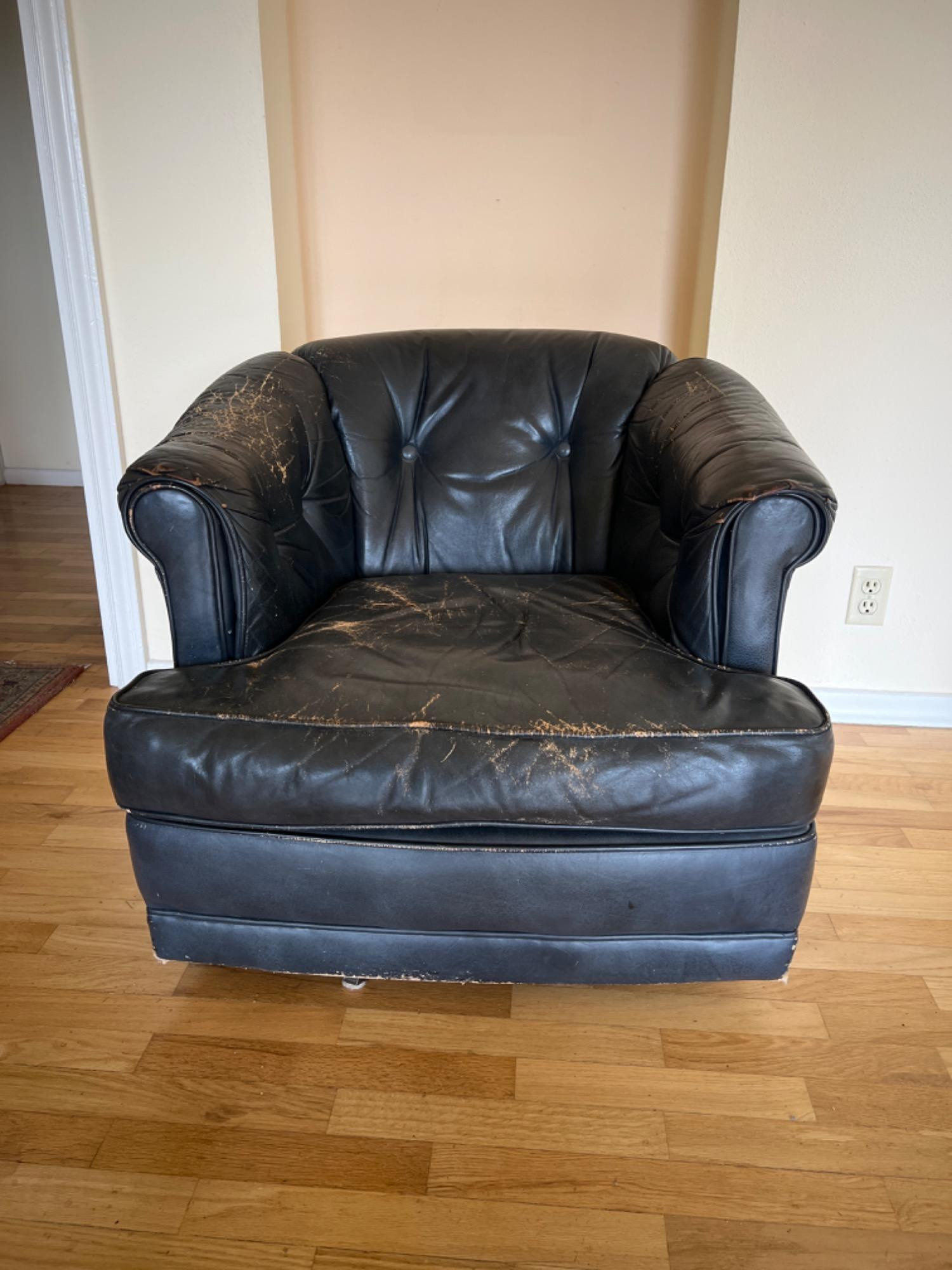 Dark blue weathered looking leather club chair. Soft and comfortable. Cushion removes from chair. Zippered back. This chair measures 32”W x 32”D x 28”H.