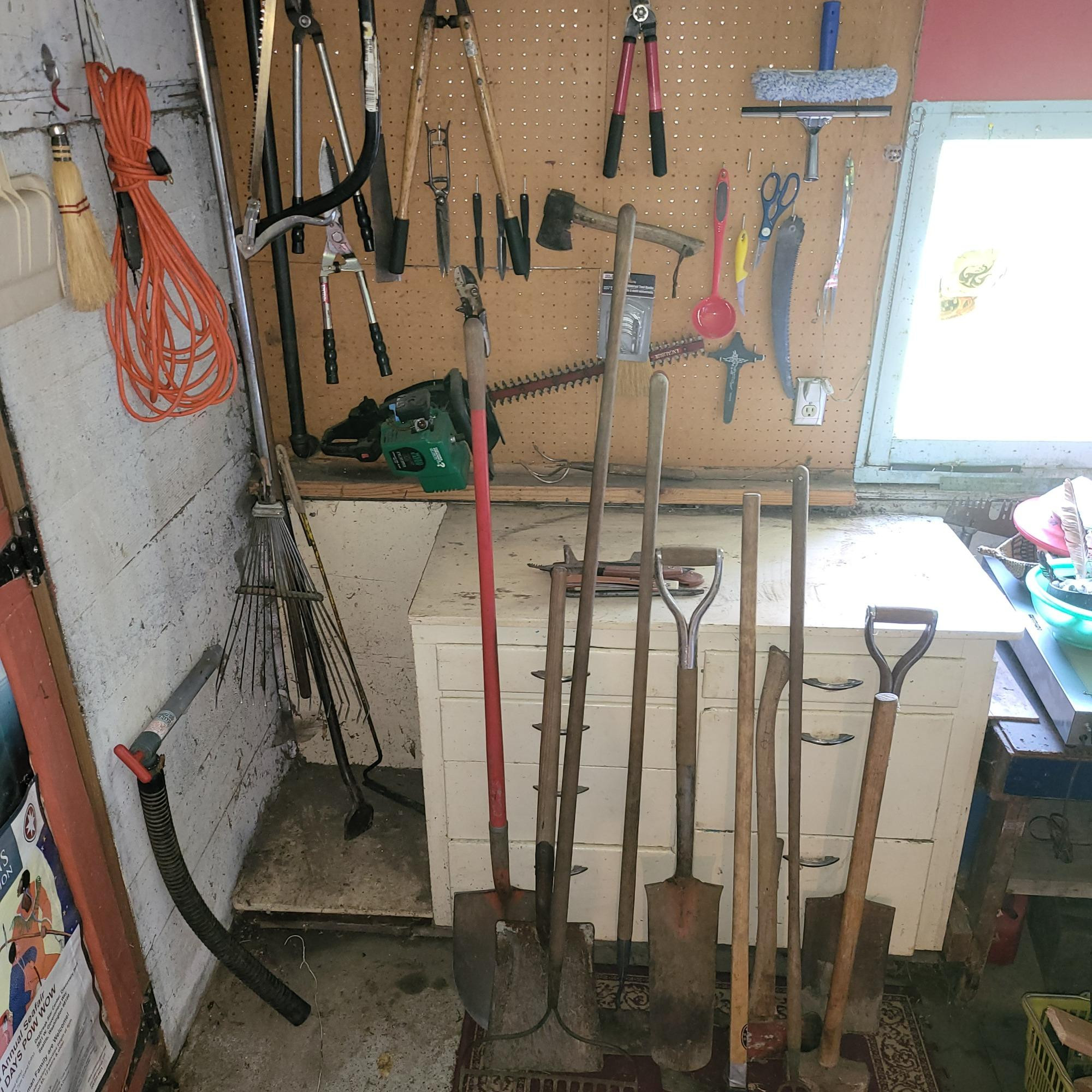 Tools for yard and garden projects! Shovels, rakes, hoes, axes, sledgehammer, pruners, gas hedge trimmer and More!