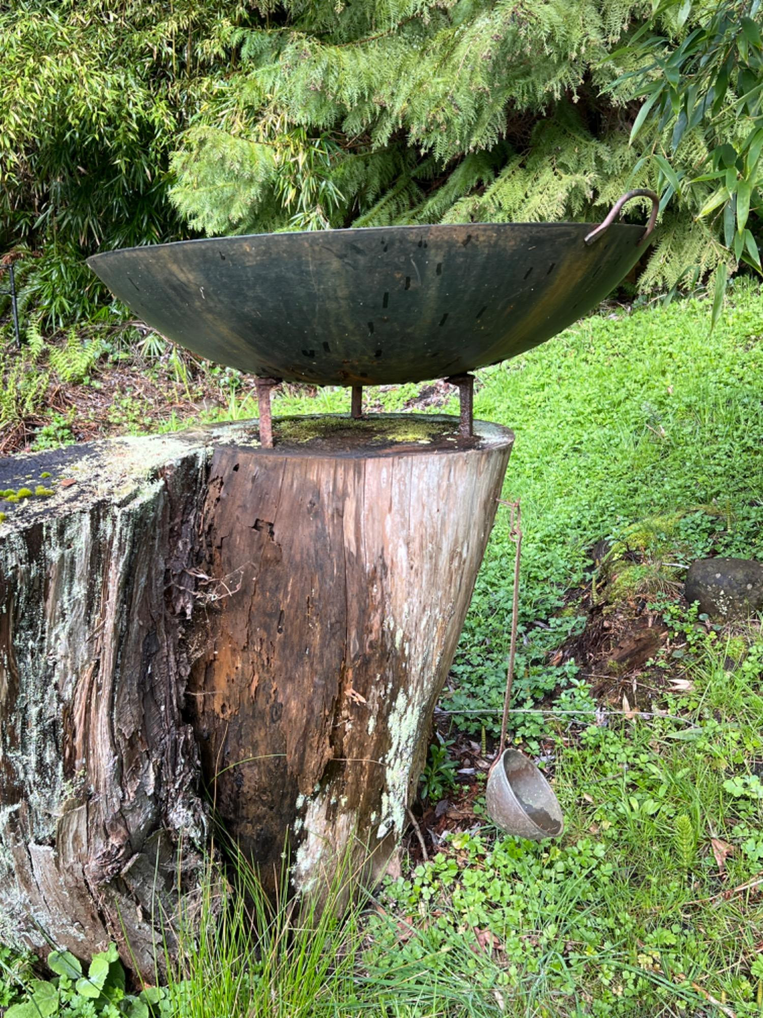 Yard art Wok & Ladle can be used as a garden fountain or a bird bath in the garden or next to a walkway. Add to it to make your own garden art. Spray paint it gold for a fun accent outdoors. Wok is 30” round x 8” tall and ladle is 18” long.