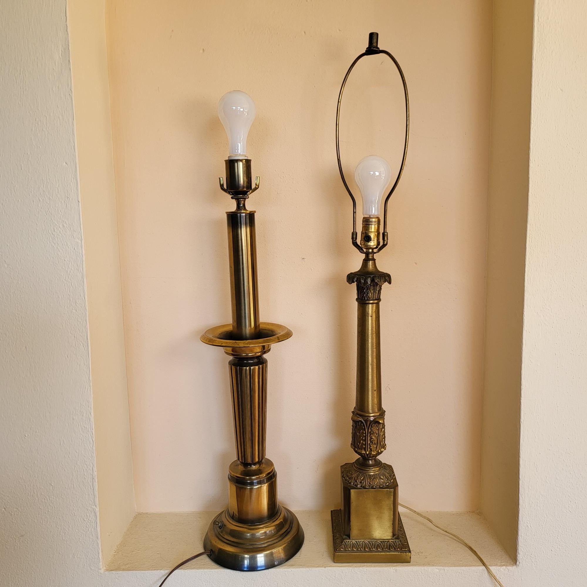 Two brass lamps in working condition and ready to use in your living room, bedroom, study, hallway or entryway. Use a soft white lightbulb with a lampshade to create ambiance or with a naked bulb for a vintage modern chic look. Great style for side tables. 34" Tall and 28" Tall to bulb.