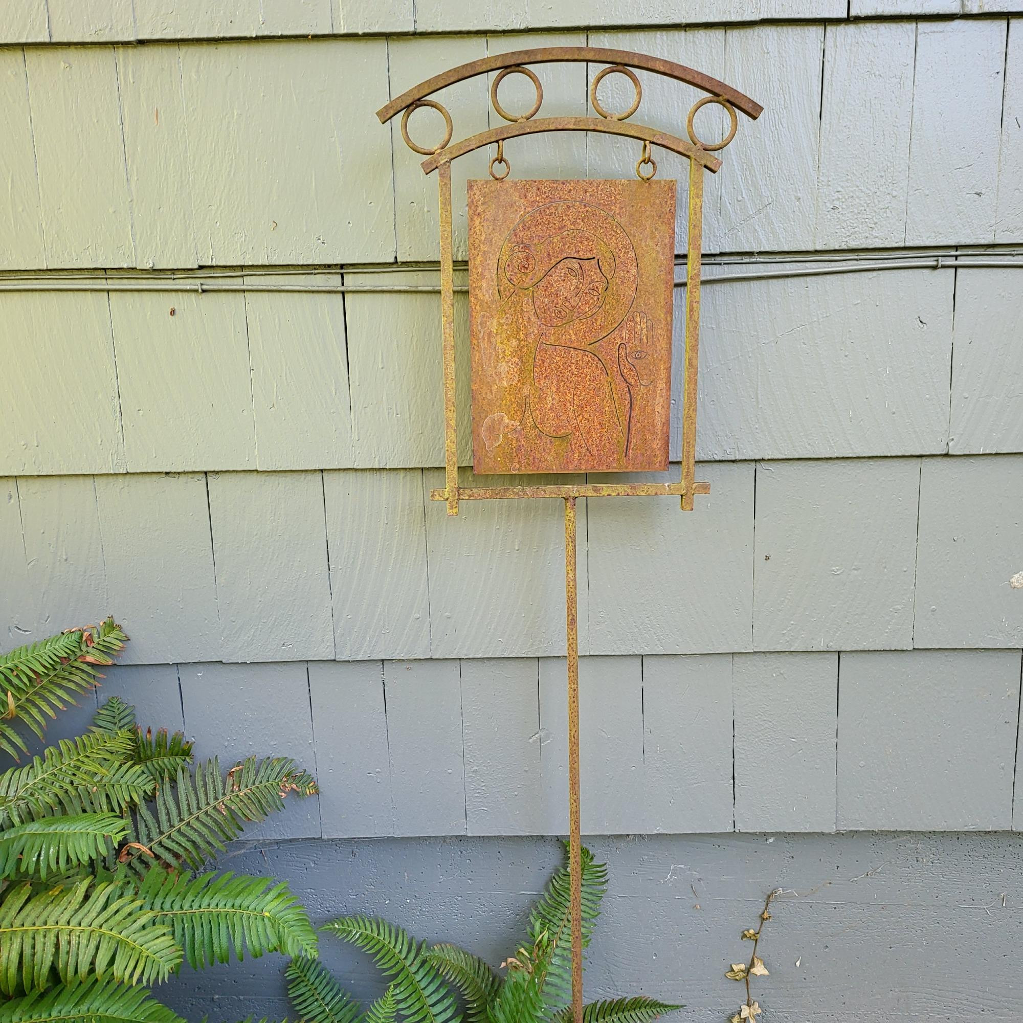 Rustic Hamsa Art garden pole displays a woman or goddess(?) with the Evil Eye or "Hamsa" (aka, Hand of Fatima). The Hamsa which is five fingers with an open eye in the palm, is said to offer oversight and protection to those it is keeping watch over. Hamsa goes back to ancient times and has a long history. 19.5" Tall x 16.5" Wide and total pole height 76.5".
