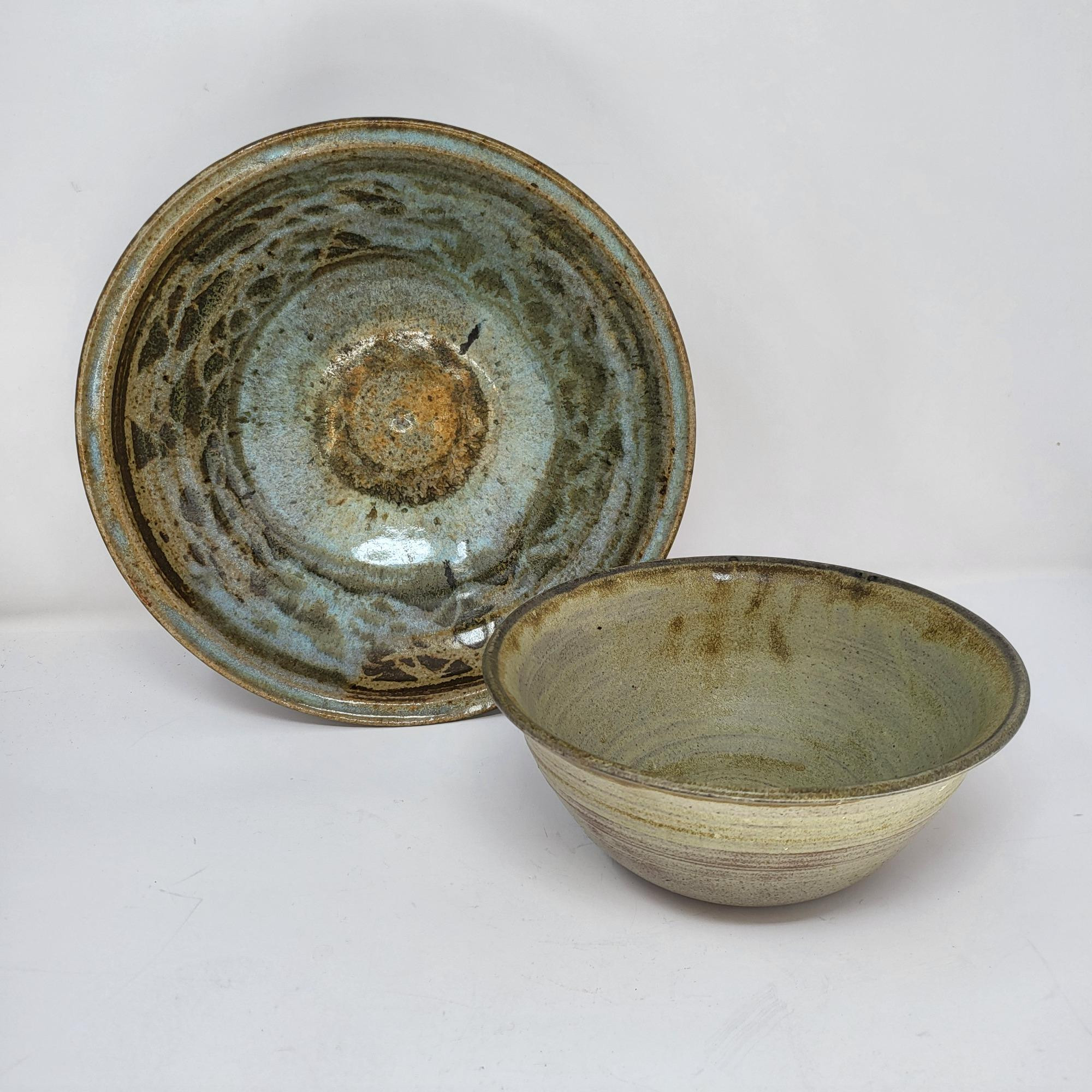 Hand made signed pottery bowls. Larger bowl is 11" x 4". Smaller bowl is 8" x 3.5". Mid century earthtones in browns and pale green.