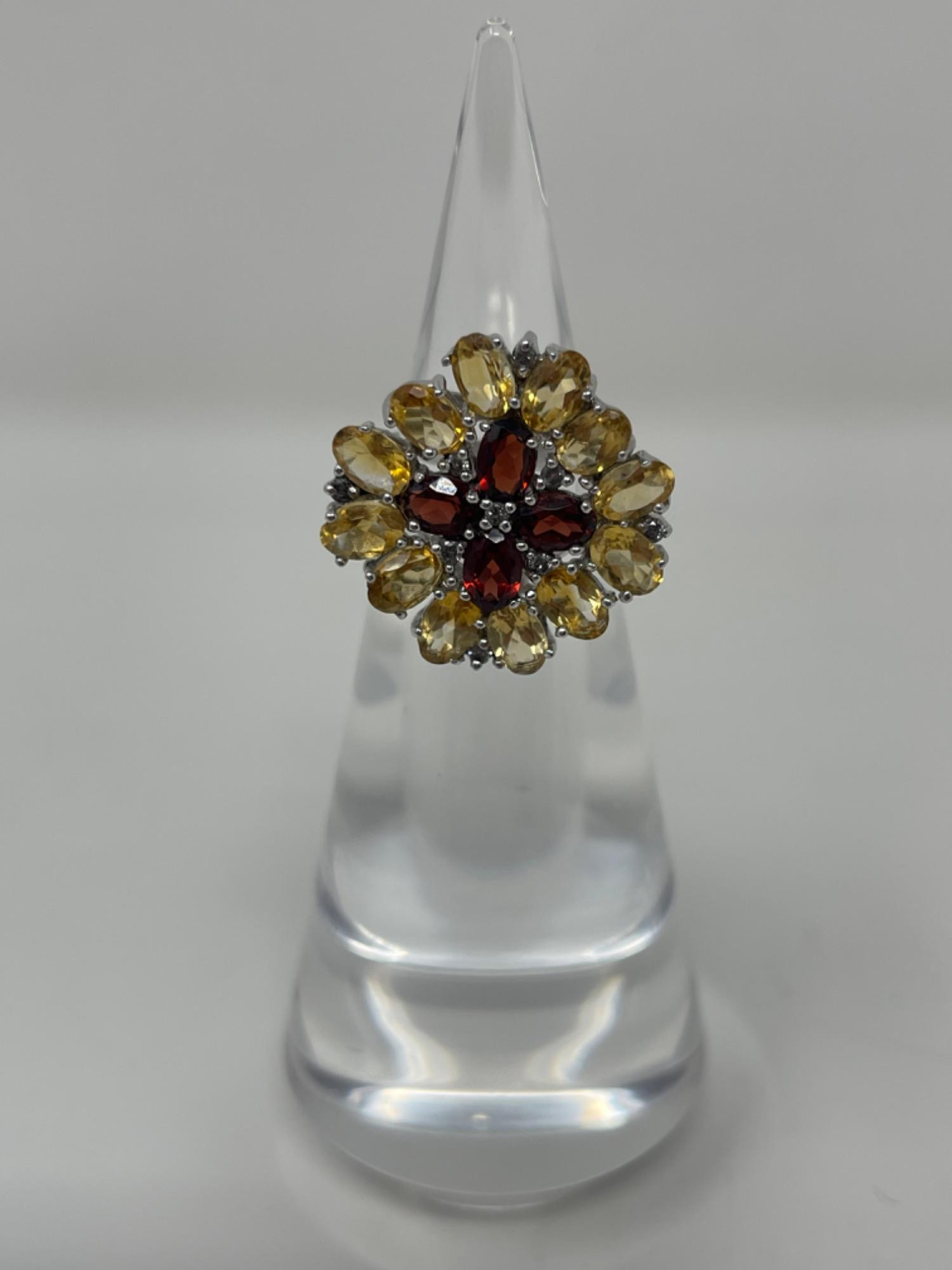 We believe the stones are citrine and garnet, but did not have it verified. Size: 7.5 Weight: 6g Marked 14k Great condition Display stand NOT included