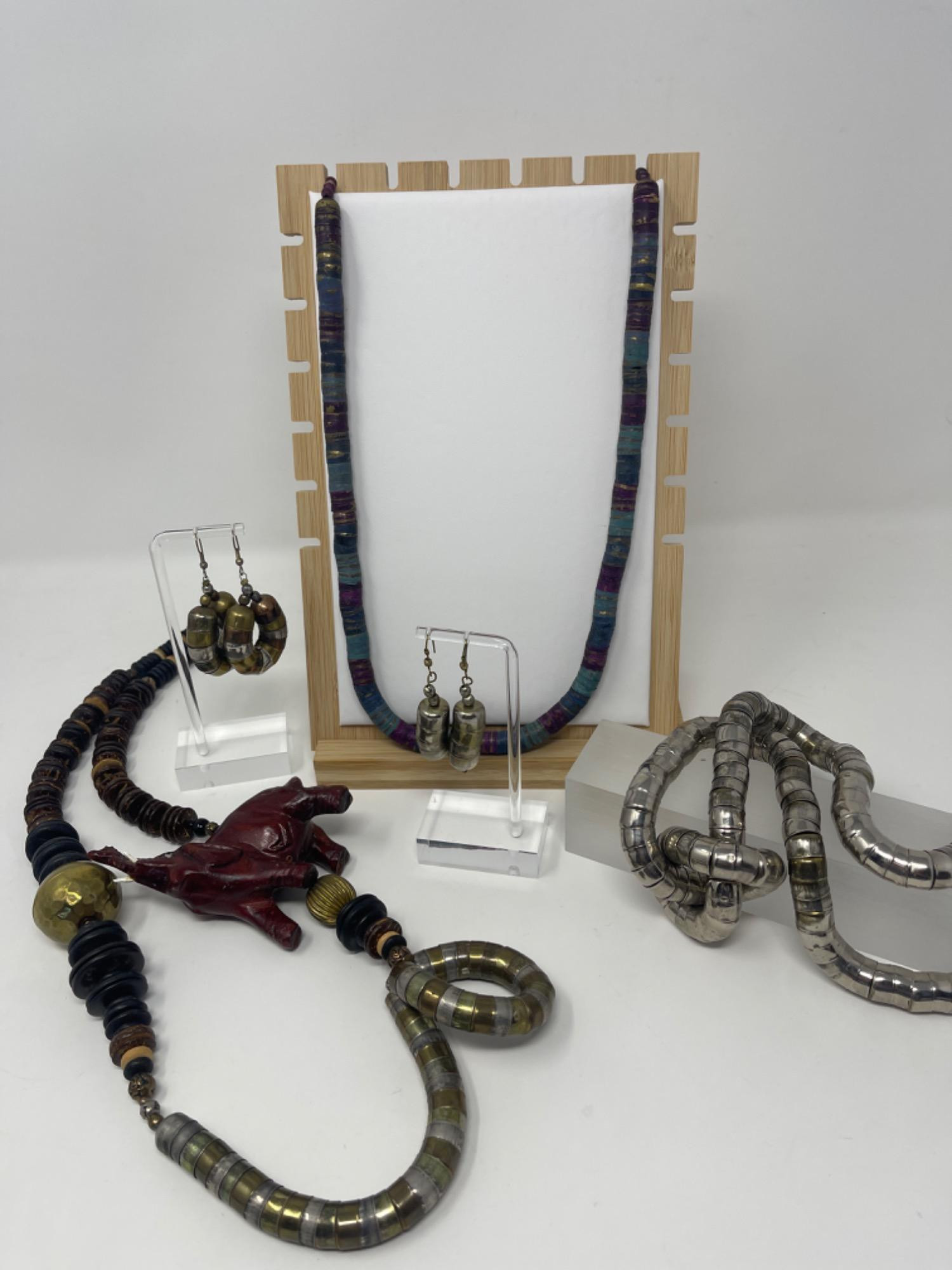 Elephant necklace: - Length: 33 inches Blue, purple & turquoise necklace: - Length: 27.5 inches Silver necklace: - Length: 33 inches Hoop earrings: - Length: 3 inches Straight earrings: - Length: 2.5 inches Displays and stands NOT included