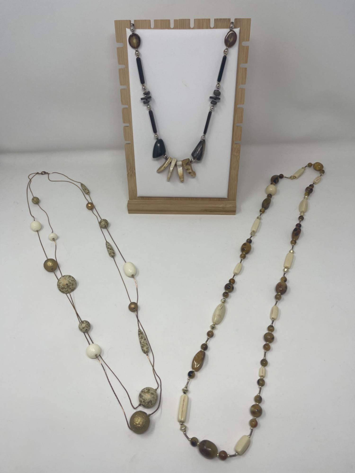 Left necklace: - Length: 39 inches Middle necklace: - Length: 30 inches Right necklace: - Length: 41 inches Display NOT included