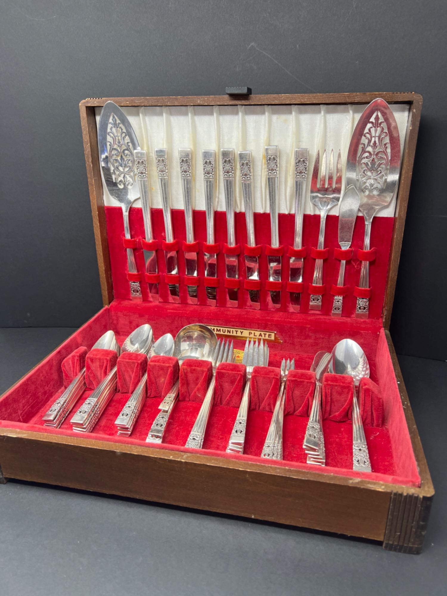 Oneida Community Plate eight place setting fine dining silverware in original wood case. Silverware pieces include: 15 teaspoons, 8 knives, 8 dinner forks, 8 dessert forks, 8 individual butter spreaders, 8 soup spoons, 8 cocktail forks, gravy ladle, sugar spoon, small slotted spoon, 2 slotted pie servers, larger butter knife, large meat fork, 3 large serving spoons and 8 small spoons (Claudia silverplate). [PP]