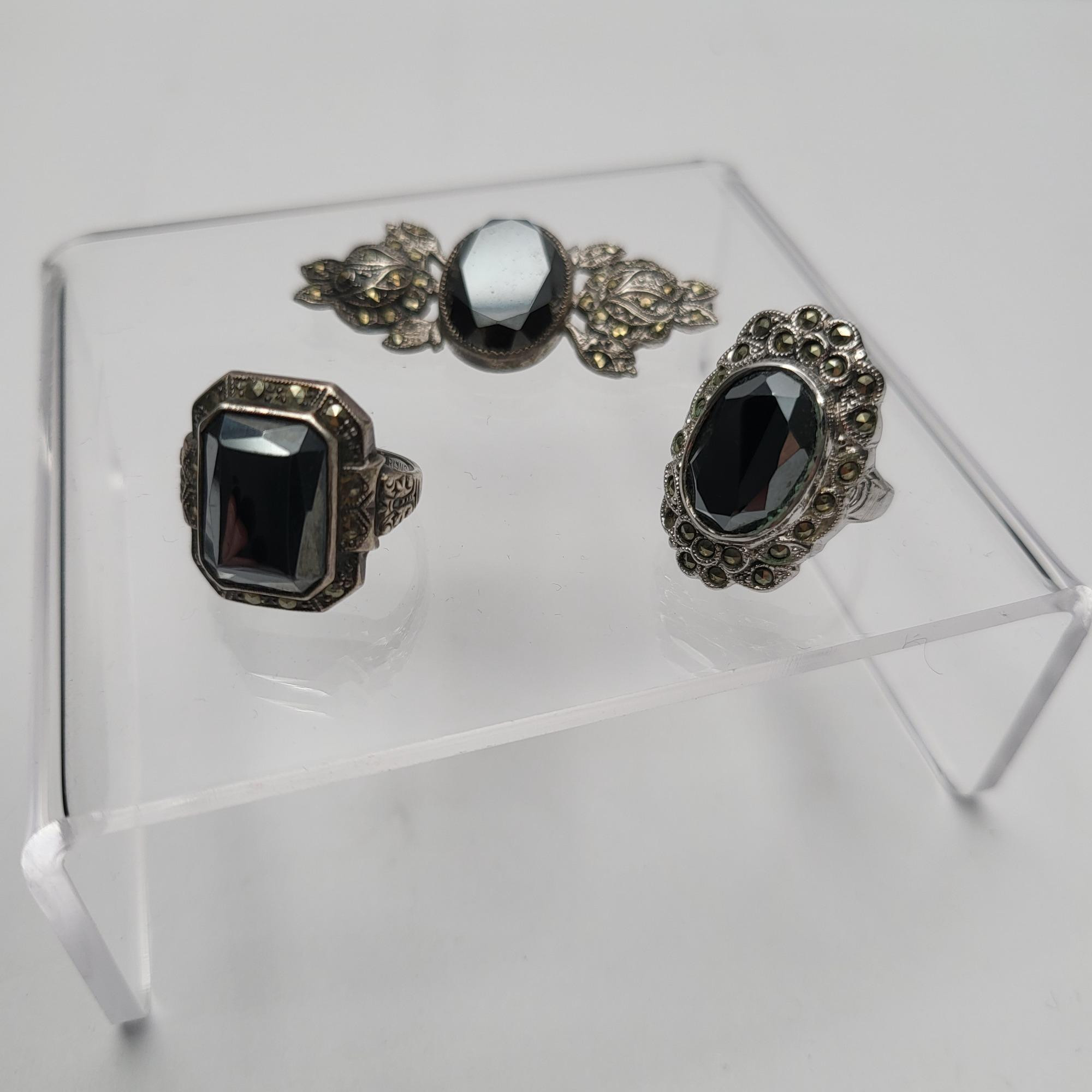 Lot # 13 - Vintage Sterling with Hematite & Marcasite - Brooch, Rings 17.9gr