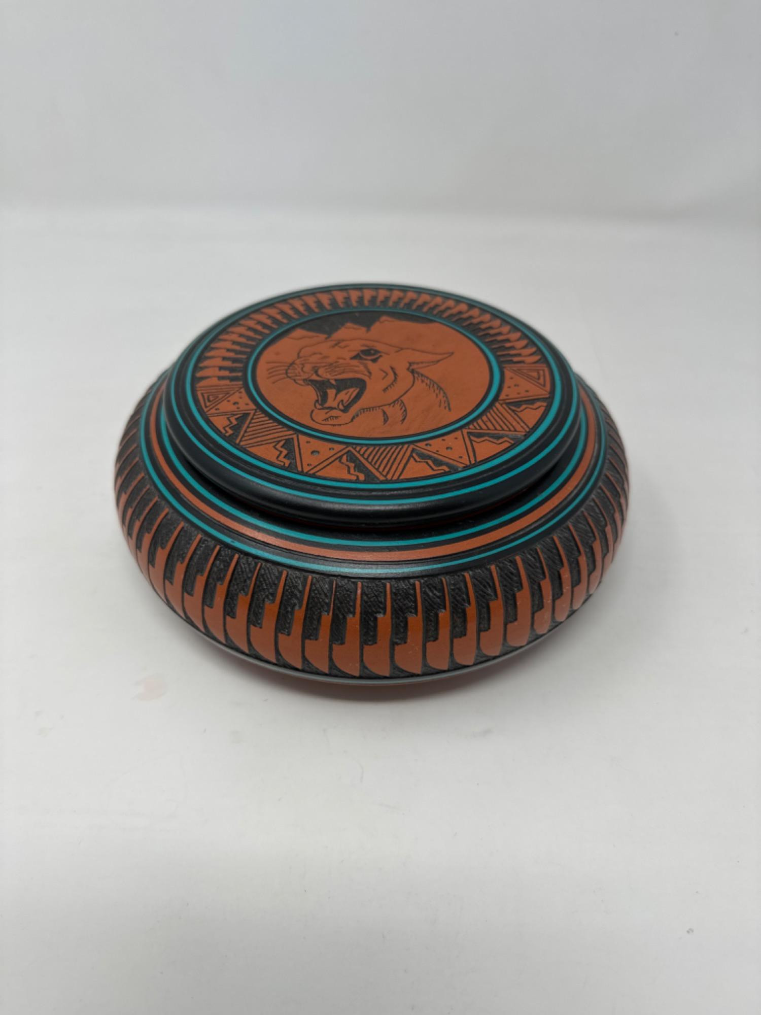 Cougar Navajo Shallow flat top bowl with lid by Jess Lansing. This beautifully made piece has amazing hand made carved designs with a very smooth satin finish glaze inside. The turquoise color ads a stunning contrast to the black and earth tone. Excellent craftsmanship and display ready. Would add a wonderful pop of color and Navajo heritage to any collection or display. Measures at 2.5" H with lid on x 5.5" diameter of lid, 7" diameter bottom [PA]