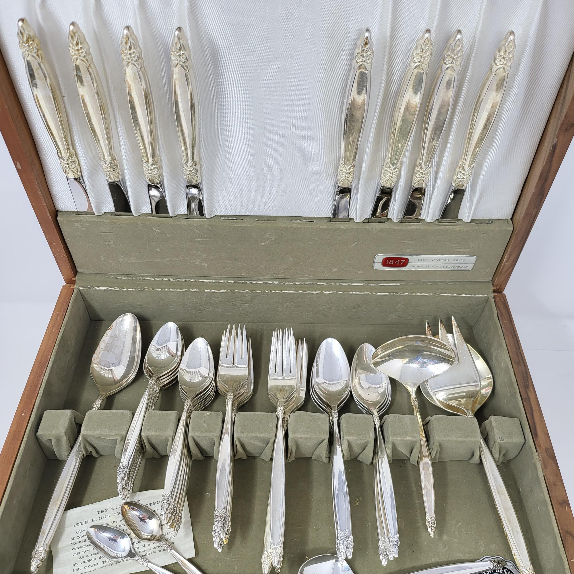 1965 Rogers Bros 1847 Garland Pattern. Silverplated flatware service for 8. Theres a few extra serving pieces in the same pattern. Protective wood storage chests included. [PP]