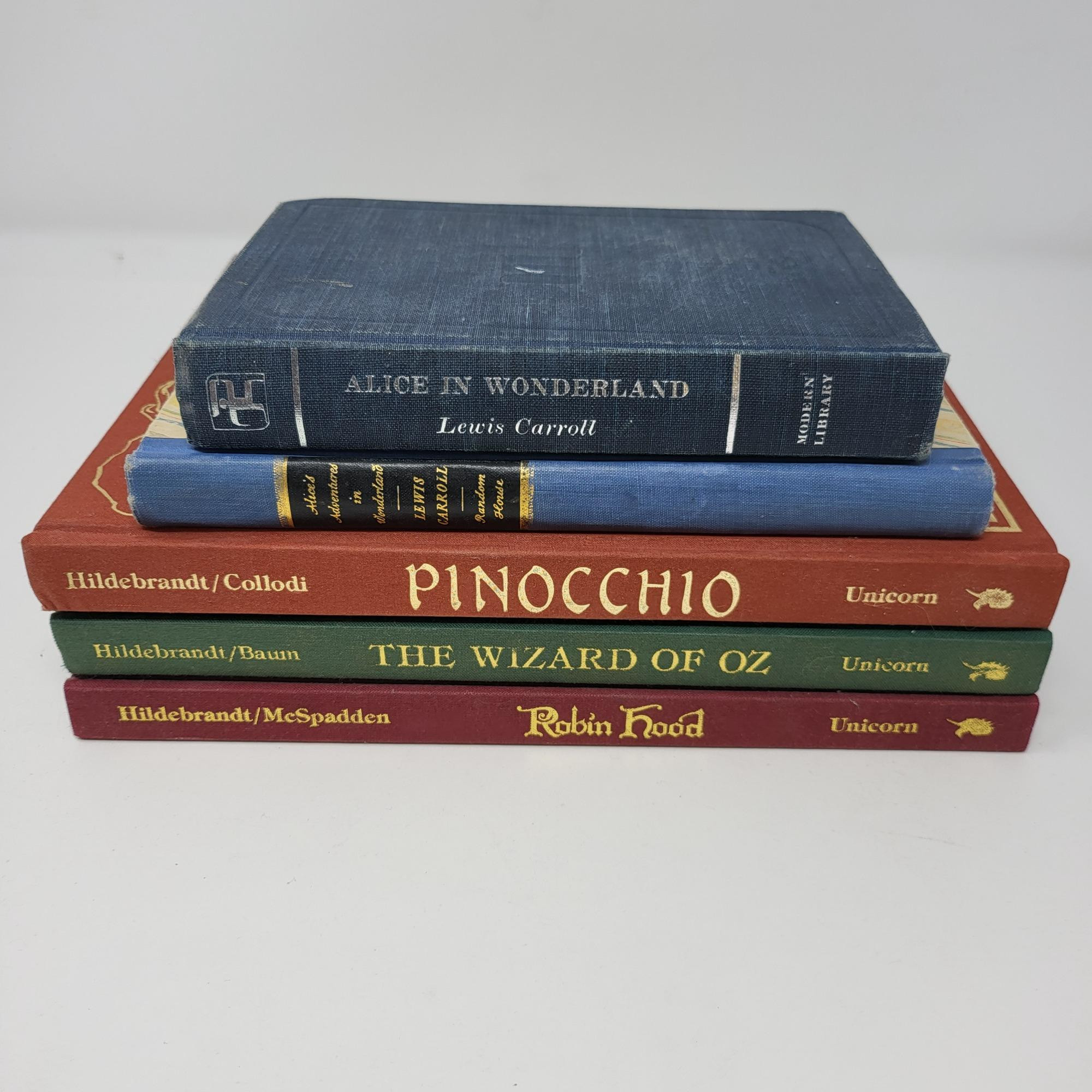 Classic titles include 1985 Greg Hildebrandt hard backs of The Wizard of Oz, Pinocchio, Robin Hood and (2) Alice in Wonderland by Lewis Caroll, 1946. [PP]