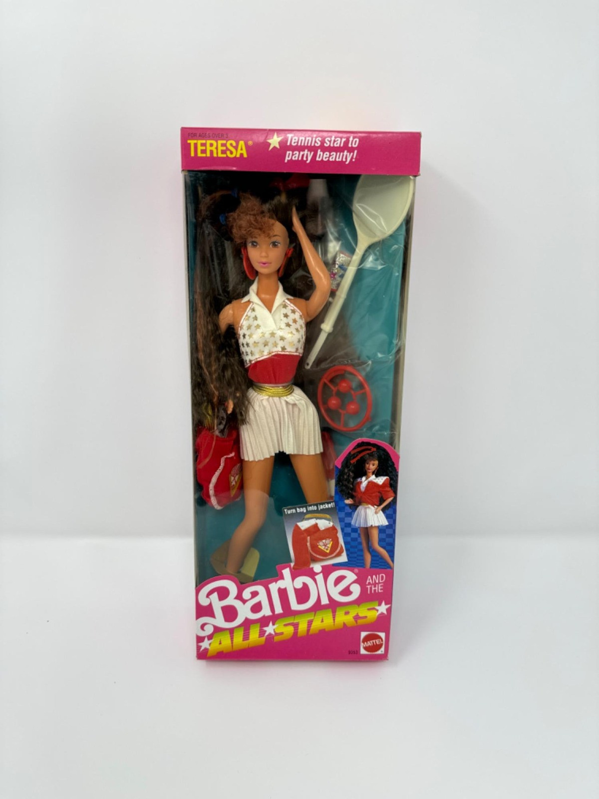 Vintage 1990 Barbie All Stars "Teresa", Never Removed From Box, sealed. In good condition, ready for display. a Latina teenage girl who was introduced in 1988 with the California Dream Teresa Doll. "Teresa" has grown in popularity and one of Barbie's core friends. The "You can be anything" slogan was inspired by Ruth Handler (co-creator of Mattel) who created the beginning of the Barbie line because she wanted to expand her daughter's dreams of what she could become in life by expanding the type of toys that she had to play with beyond baby and porcelain dolls. History of Barbie Timeline. Promoting the dreams of girl athletes, encouraging Latina girls to dream bigger, Teresa would be a wonderful addition to any collection or to inspire a young dreamer. Measures at 13" H x 5" W X 2.5" D. [PA]