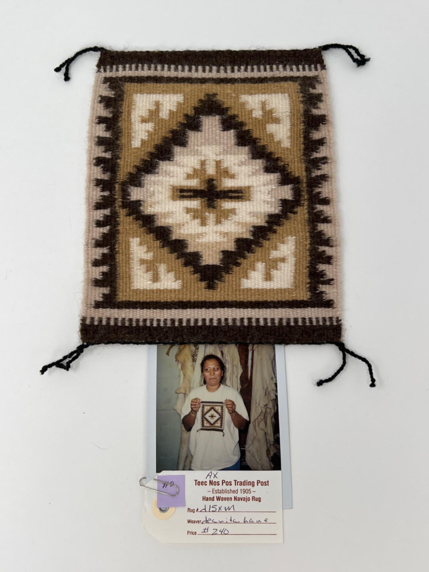 Navajo Dineh mini rug handwoven by Desrita Lane (see picture). Size is 8-1/2” x 7-3/4”. Purchased at Teec Nos POS Trading Post for $240. [PA]