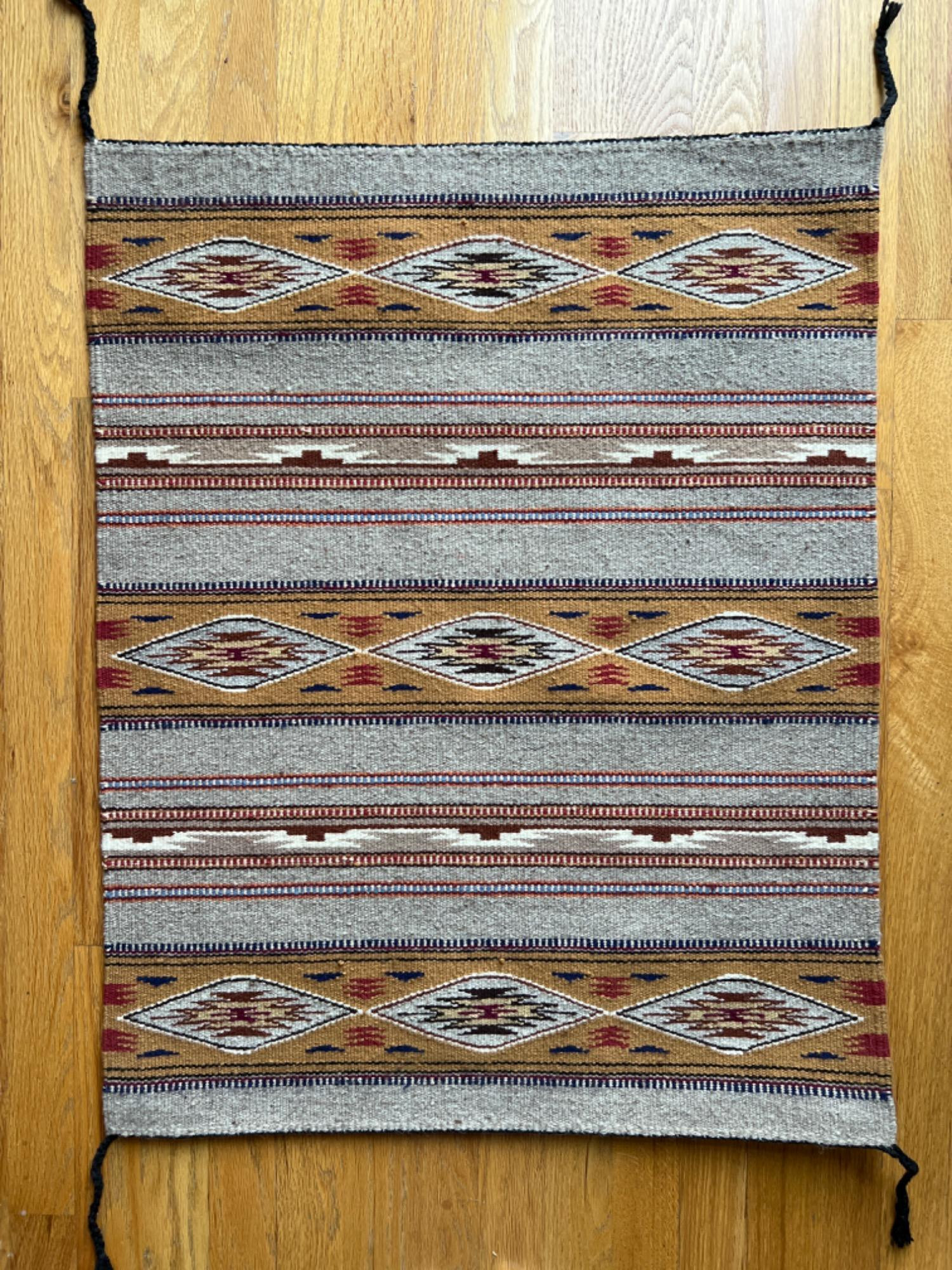 “Wide Ruins” is a 100% wool, handwoven rug that has black ties and wool dye colors of grey, red, white, dark blue, dark brown, yellow, medium purple, Lt. blue, and navy blue. Weaver artisan, Bessie Littleben, is listed in the book, “American Indian Textiles”, page 68. Bessie is a Native American from Piñon, Arizona. Referenced: Notah Dineh, Cortez, Colorado. 25” x 33”, purchased September 2002 for the price of $750. [PA]