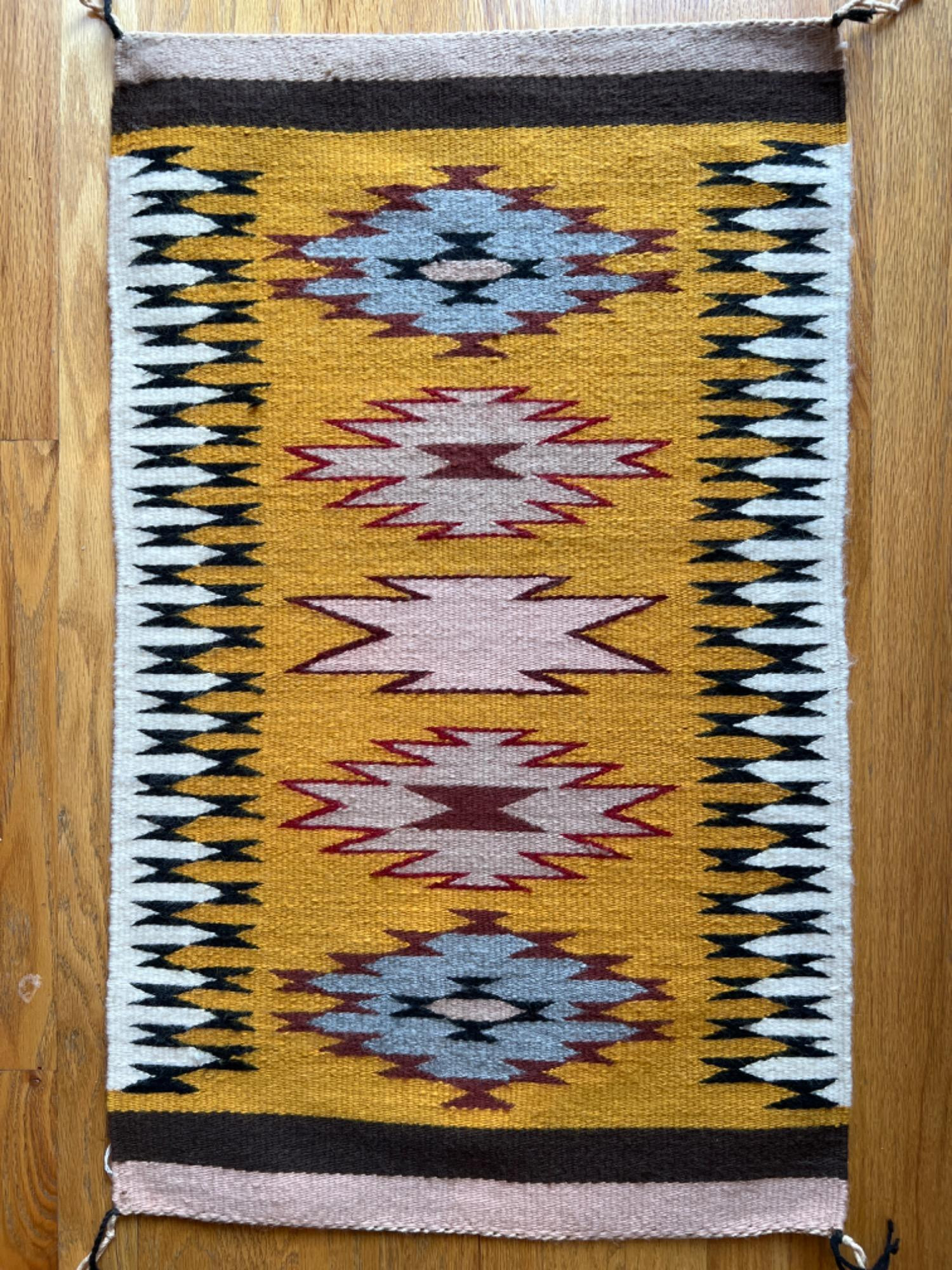 Handwoven, hand-dyed 100% wool rug by Navaho weaver, Nancy Johnson (1928-2008). Nancy is renown for her exquisite hand weaving. Rug is 20” x 32”. [PA]
