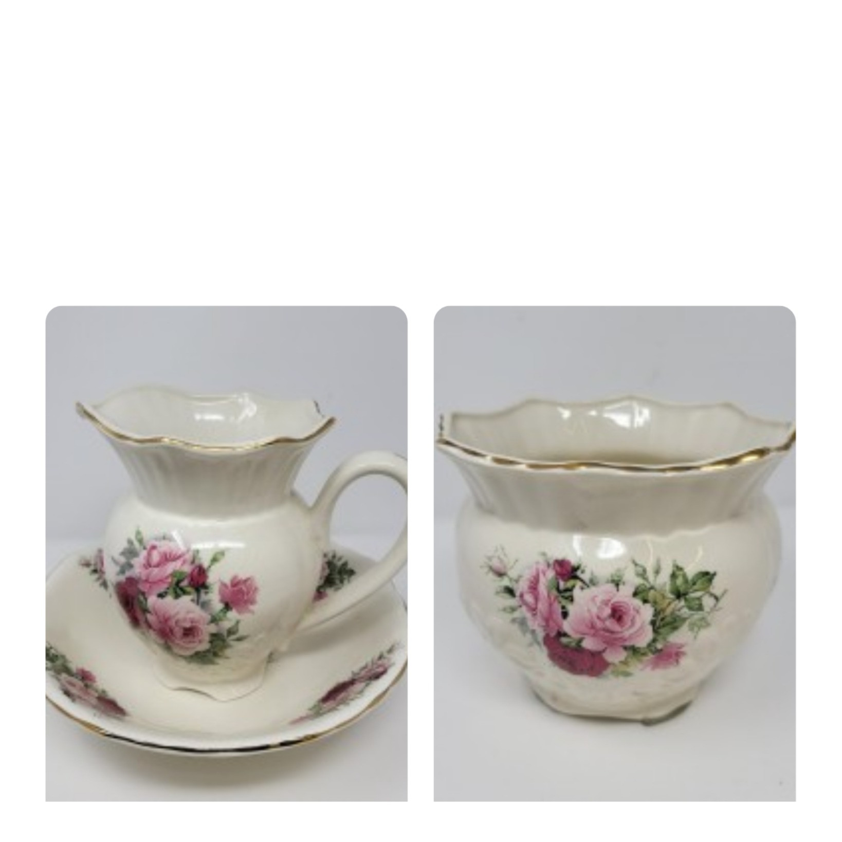 Vintage, Maryleigh Pottery. All three pieces matching, rose bouquet pattern with gold trim. Set includes 11"W x 3"T basin/bowl, 7.5"T x 6"W pitcher and 5.5"T x 6"W planter. [PP]