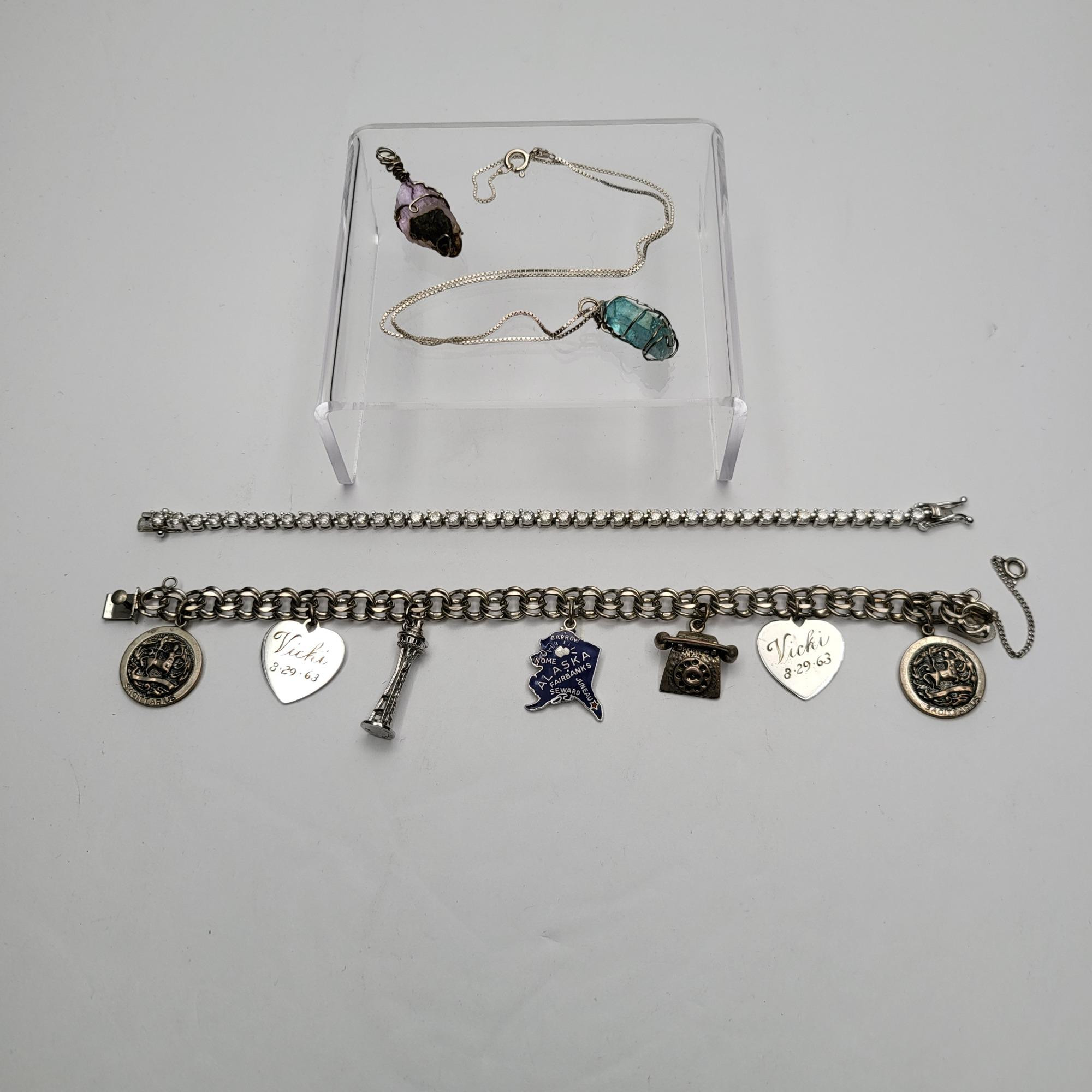 7.5" clear CZ stones 925 silver tennis bracelet Vintage sterling silver charms bracelet 7.5" long with charms - Space Needle, Alaska, telephone, charms with engraved name (Vicki) 1946, 1963. Solid push clasp & safety chain. Two 1" silver wire wrap crystal pendants and 15" sterling box chain. [PP]