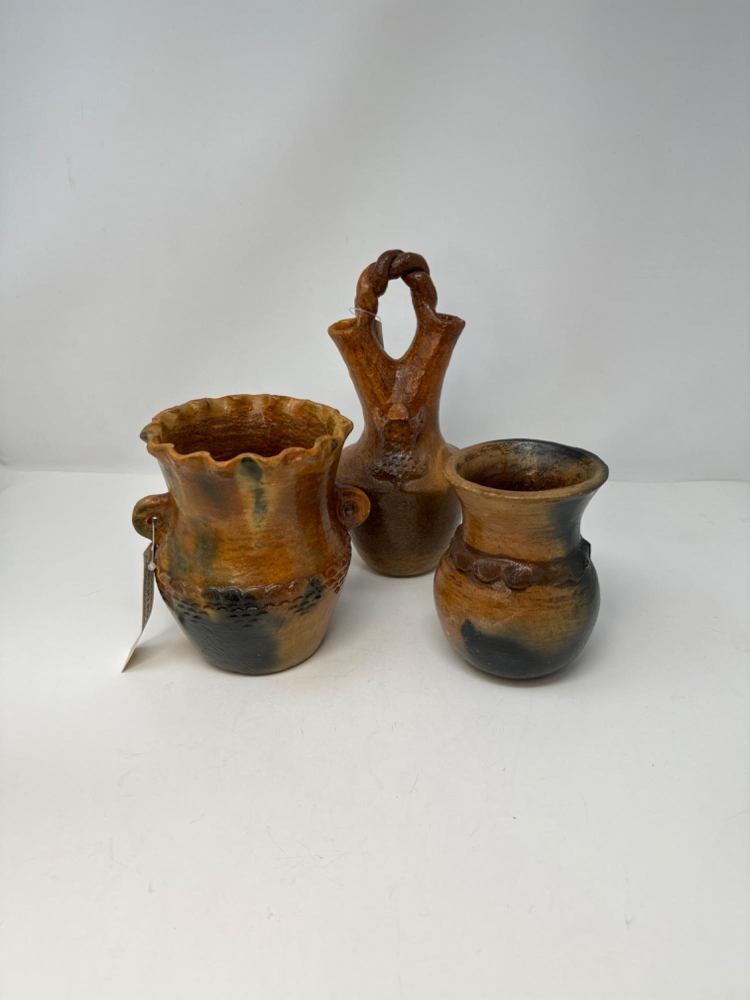 A beautiful trio of pottery ready for display. Scalloped water pot measures at 6" H x 5" approx. diameter in middle. Wedding pot with frog measures at approx. 9" H x 4" approx. diameter at middle. Small fluted pot measures at 5" H x 3.5" approx. diameter at middle. [PA]