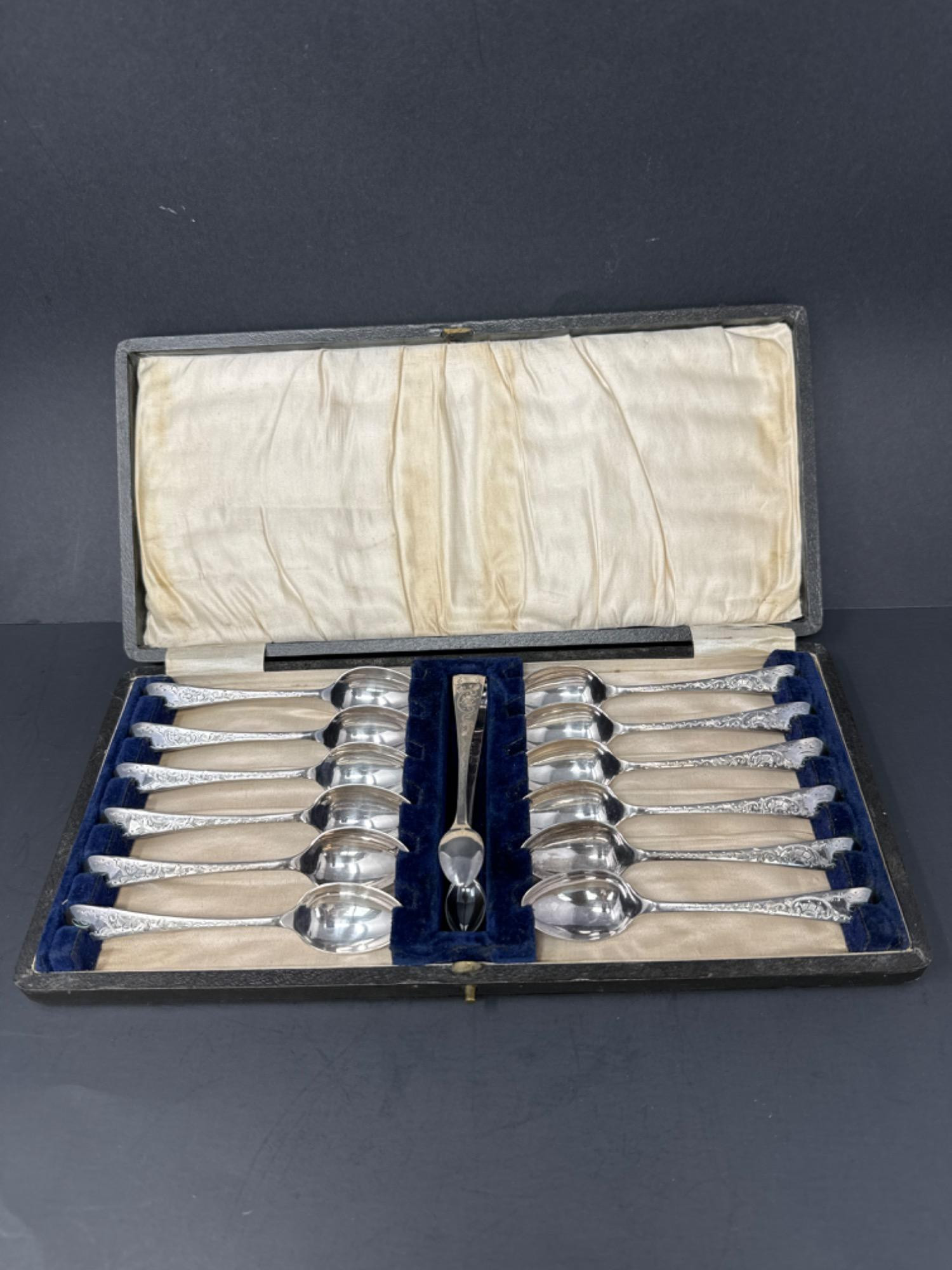 Set of 12 beautiful electroplated silver tea spoons and sugar tongs with an initial on the end of each spoon. Tarnish free velvet lined hard case. This set is by W.S.S. & Co. (marked EP).