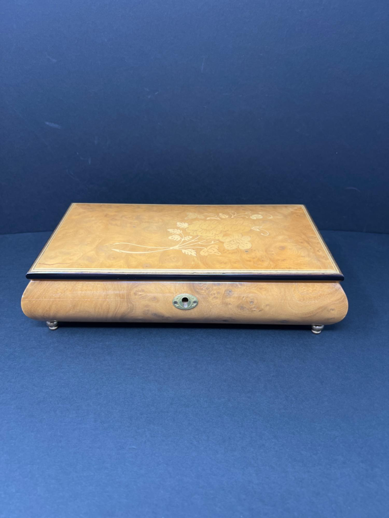 This finely crafted wood inlay Sorrento, Italy musical jewelry box is made from a type of burlwood with layers of cut pieces to form the floral design. Entire box is lacquered and lined with velvet. The music works is a Swiss movement made by Romance (formerly Reuge) company. The song played is “ Time Goes By”. The key is for show and does not function as a lock. There is a side insert that can hold rings. size: 11” long x 6” wide x 3” tall
