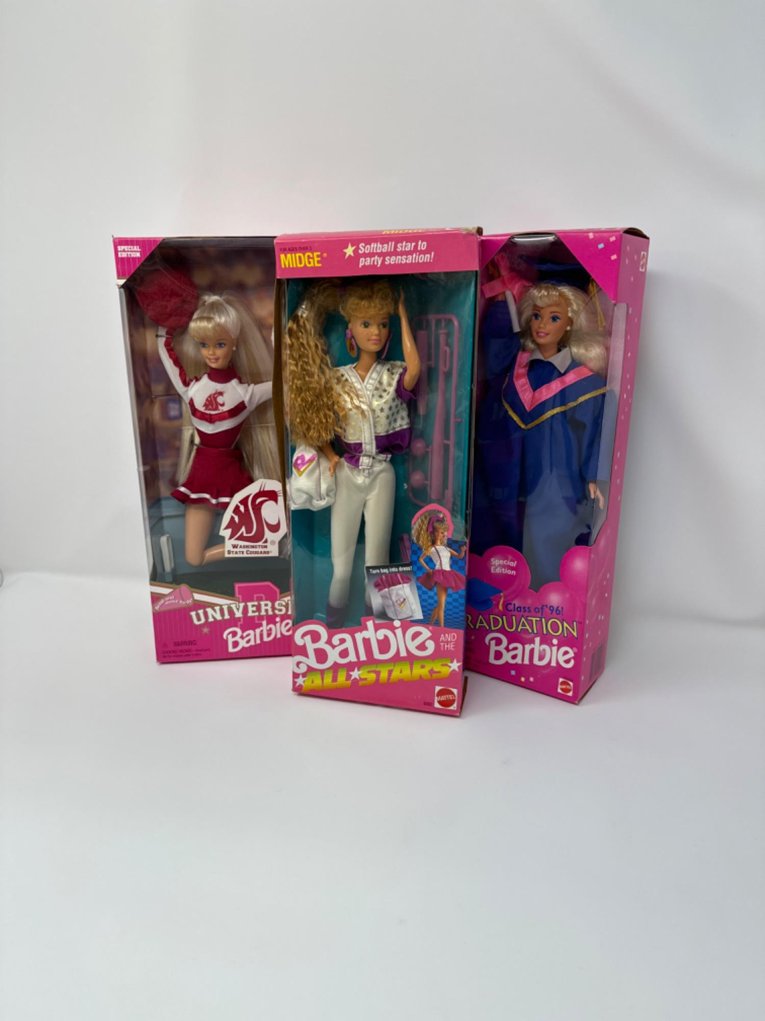 Collection of special edition vintage Barbies. Midge from the Barbie All Stars collection 1989, NRFB & sealed. A little wear on corner, side of box protrudes a little, window has a little wear. Class of '96 Graduation Barbie (1995), NRFB & sealed, was the first special edition made to commemorate the graduating class of 1996. Box is in good condition, two small dents, window has a little wear, but still good. University Barbie - Washington State Cougar special edition with bendable body, NRFB & sealed. The special edition series was first released in 1996 for 20 schools, Box in good condition, little wear on edge of corner flap, window in good condition