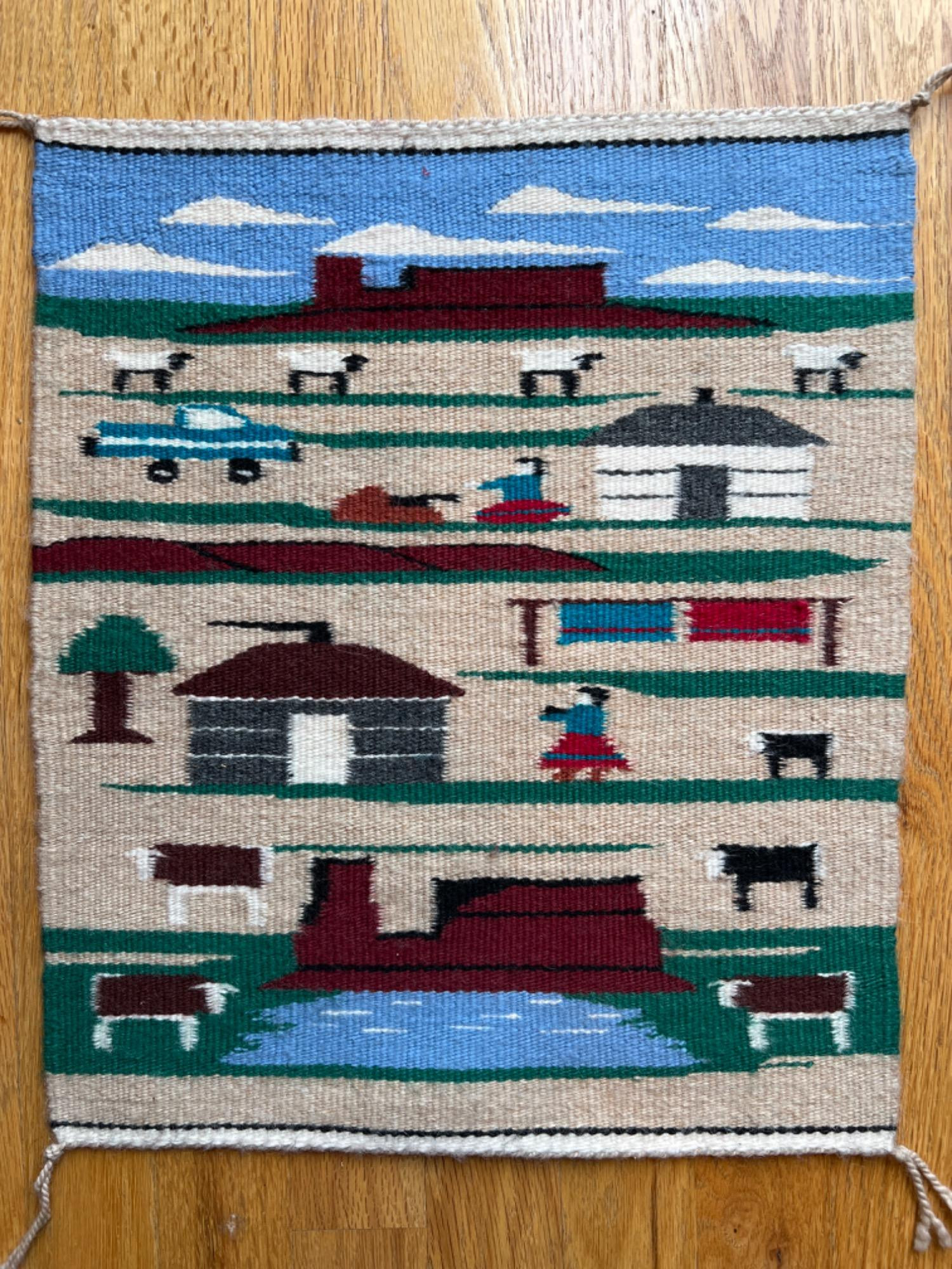 Expertly woven by Alice Sequine is this small pictorial rug that brings a smile to anyone viewing it. Originally purchased 2008 in Arizona at the Teec Nos POS Trading Post, handwoven, with picture of artist holding the rug. Rug is 14.25” x 17”.