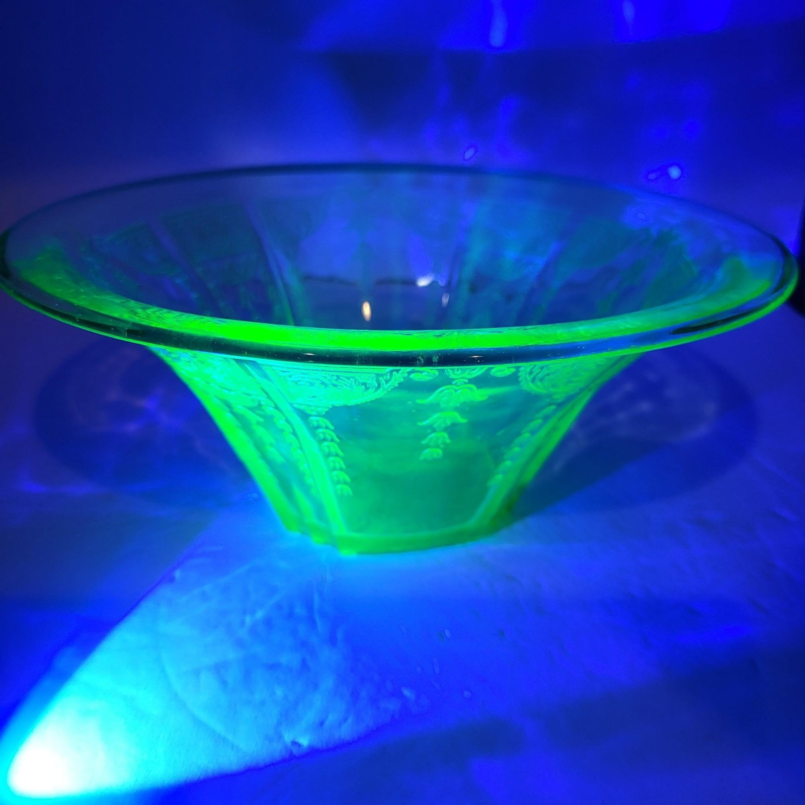 Green depression Uranium glass fruit bowl, Princess pattern. Measures 9" diameter and tapers to 3.25" at the base and is 4"T. Glows under UV light. [DM]