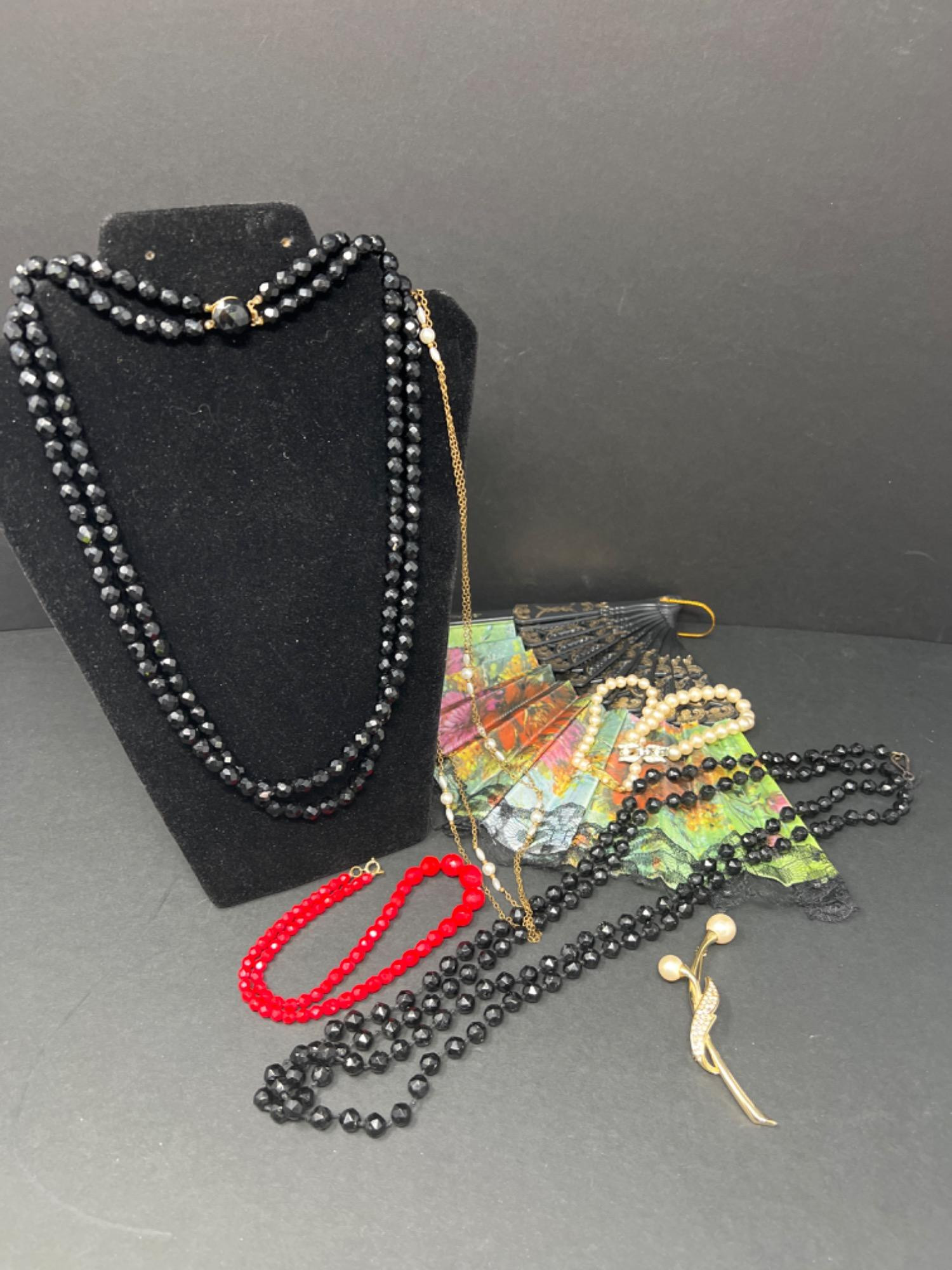 56” continuous chain necklace with small pearls and white beads 3.5” rhinestone and pearlized bead brooch 24” black beaded double strand necklace- weight 90 grams 58-60” long black beaded strand necklace - 67 grams Red bead necklace is 16” long