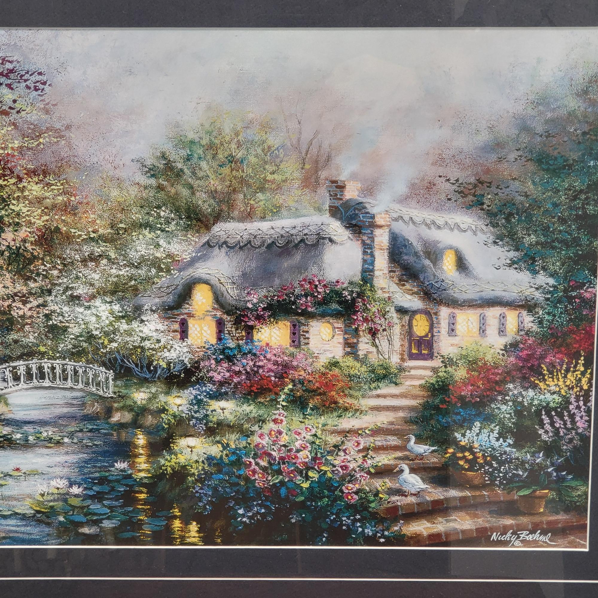 In the style of Thomas Kinkade, artist Nicky Boehme captures the light and great detail throughout this serene cottage bridge setting. Gold painted frame has a few flaws on edges (see picture). Measures 31.5"w x 25.5"T. [PP]