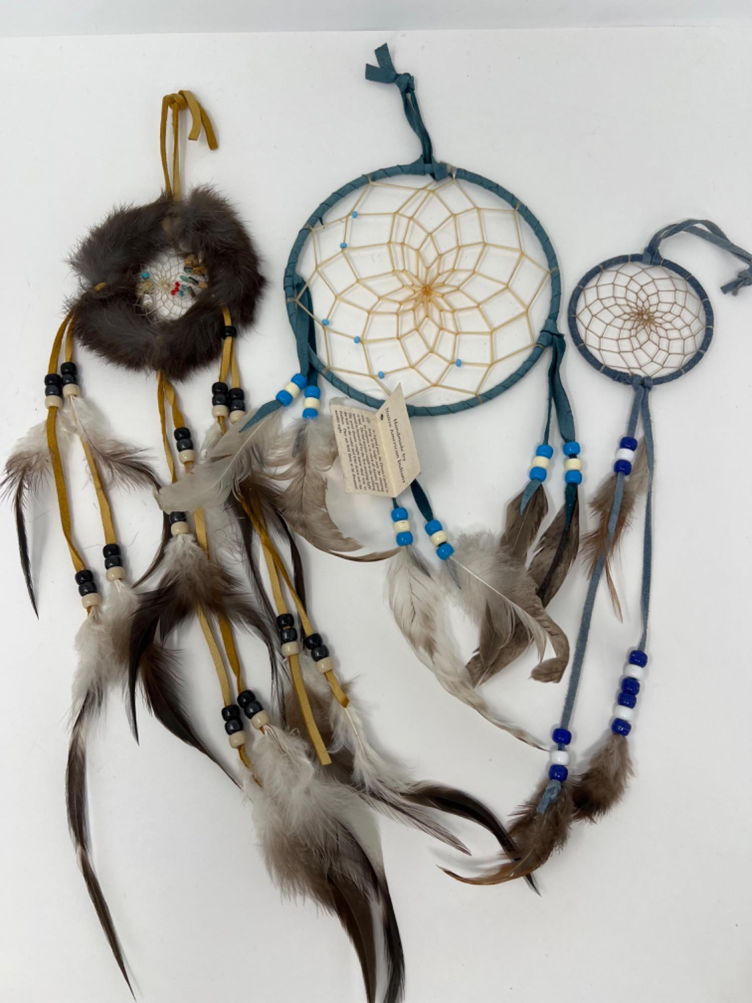 The blue dreamcatcher has a 6” round catcher and is 14” long with beads and pale grey feathers. Fred Harvey Trading Company. There is a turquoise piece which represents peace and balance. Dark brown 3.5” fur covered catcher is 18” long widfth leather & feather and beaded strands. The smaller blue dreamcatcher has a 3” round catcher and is 14” long with beads and brown and auburn feathers.