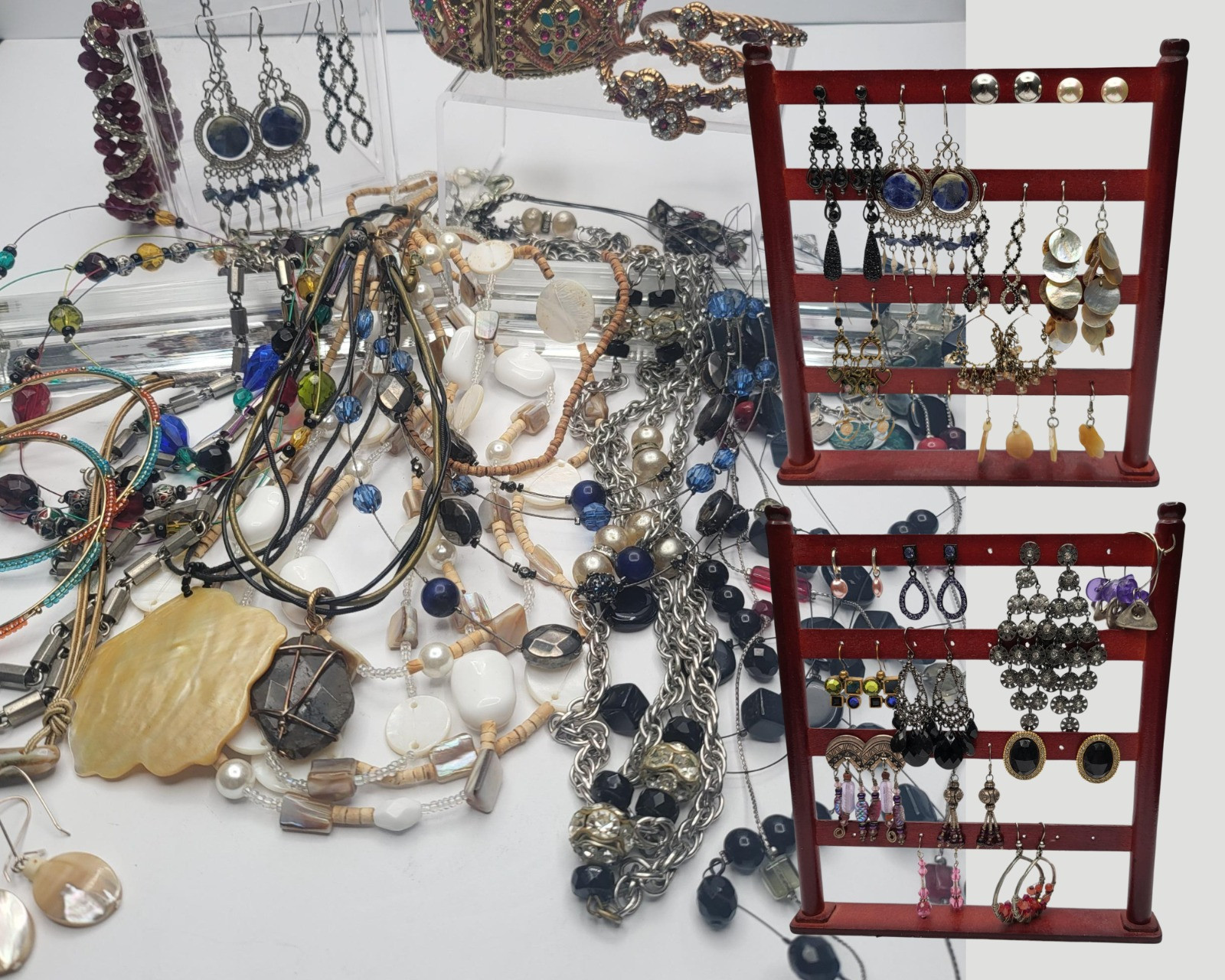 Fashion jewelry including glass beaded necklaces and bracelets, rhinestones, blue Lapis, Mother of Pearl and more. Also included are pierced earrings, bracelets and necklaces in various styles and lengths. A few are signed Chico's. [PP]