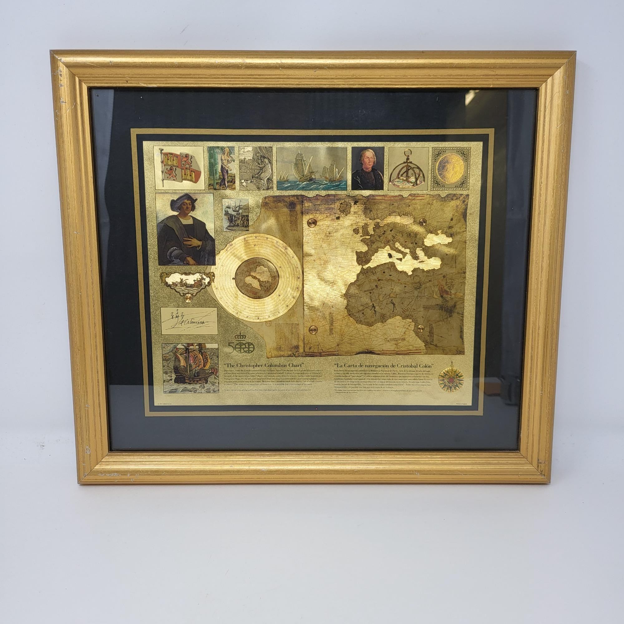 Framed and Gold foil 500th Anniversary of Christopher Columbus, maps picture 15" x 13". Has COA on back. [DM]