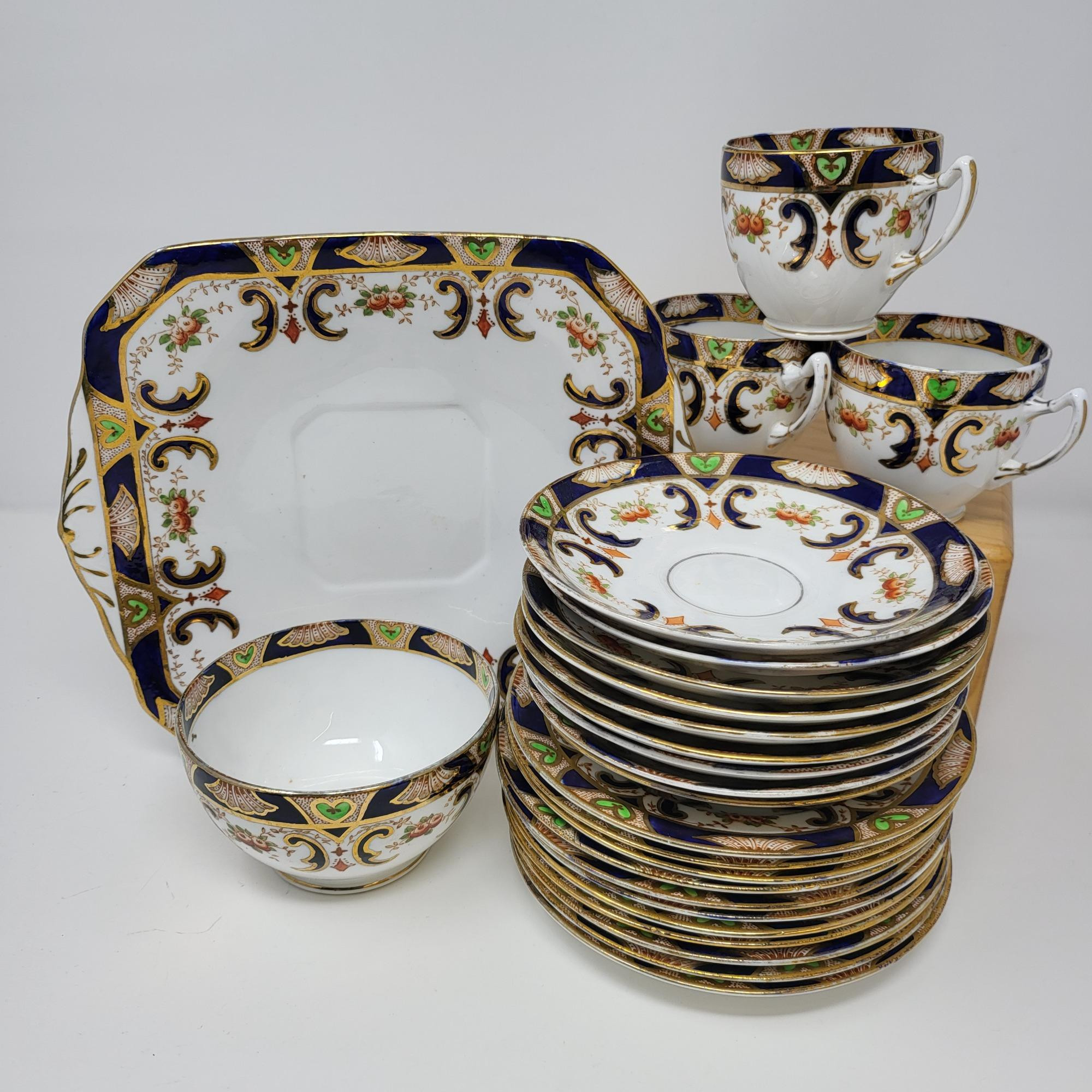 Imperial Derby china set made in Long Port England by Thomas Hughes and Sons Ltd. Early 20th Century. This set contains (11) 6" dessert plates, (9) 5.5" saucers, (3) 3" x 2.5" teacups, 8.25" serving plate, and a 4.25" x 2.5" bowl. It is marked 1713 Standard China England. [PP]