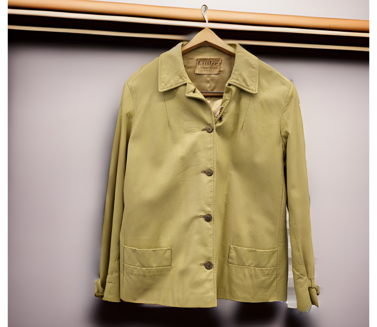 Vintage light olive green women's leather jacket size 14. Samuel Robert Original sold by Littler Women's Apparel, Seattle. 4-button front. Has a Deco pin attached towards the top. [DM]