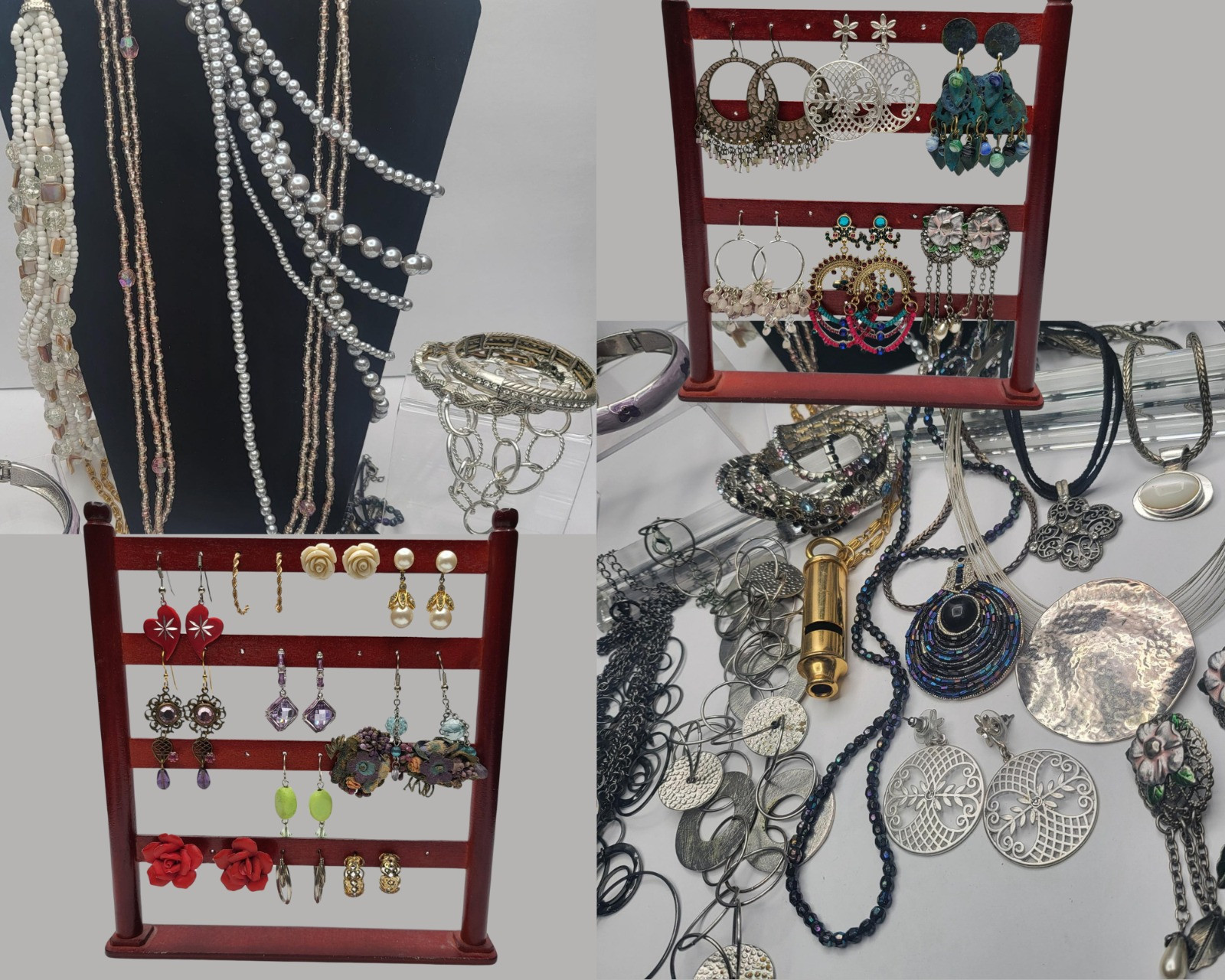 Fashion Jewelry for every occasion. Many Retro styles. Faux light blue pearl multi strand necklace, glass beads necklaces, rhinestone stretch bracelets, pastel enameled bangle trio. Cool multi strand abalone necklace, several dangle pierced earrings and many other styles. A couple pieces are marked Chico's. [PP]