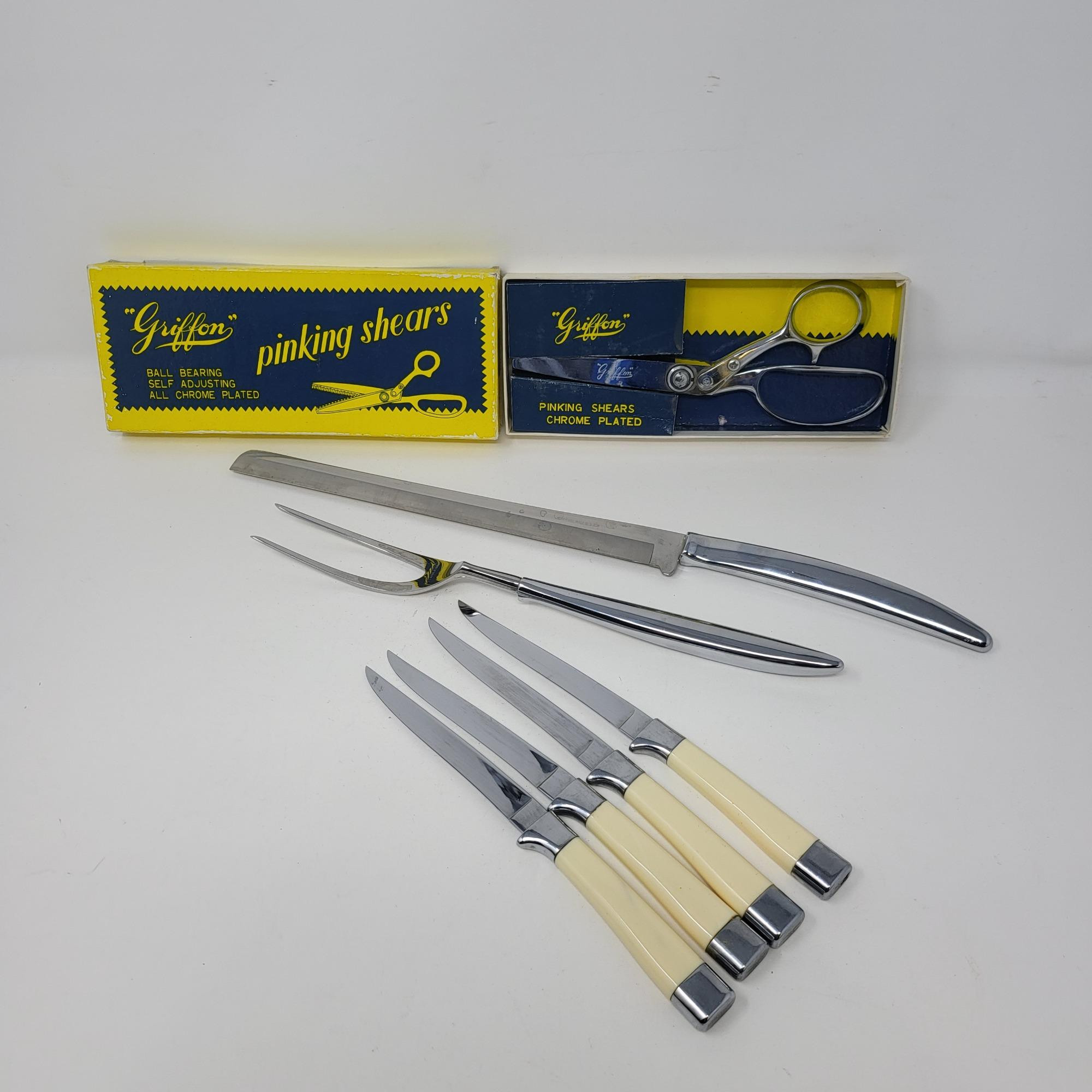 Vintage kitchen items: Carvel Hall Briddell steak knife set with original storage case. Carvel Hall meat carving knife & fork set. Griffon Pinking shears in original box. [PP]