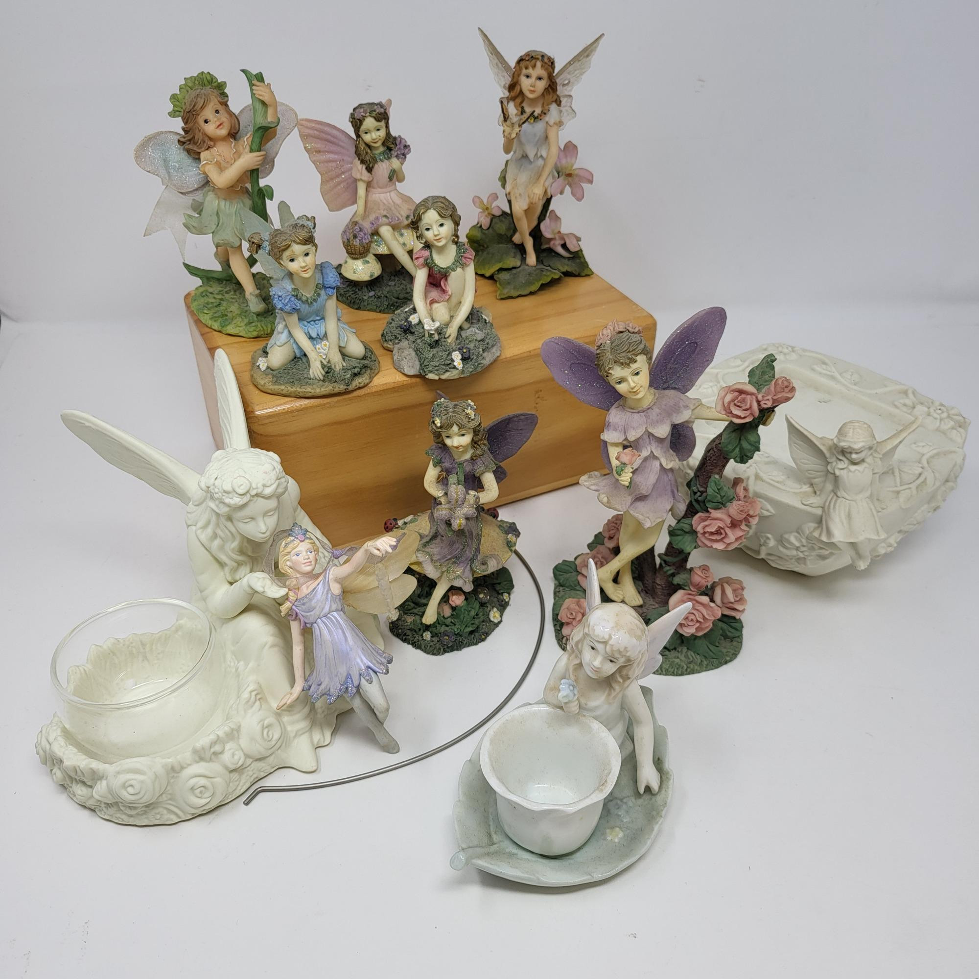 Detailed, decorative, resin fairy figures. Some are numbered from the Fairy Collection and Summit Collection. They range in size from 3" to 7" tall. A couple have flaws (see photos). Two Party-lite ivory colored ceramic candle holders and one ornament. [PP]