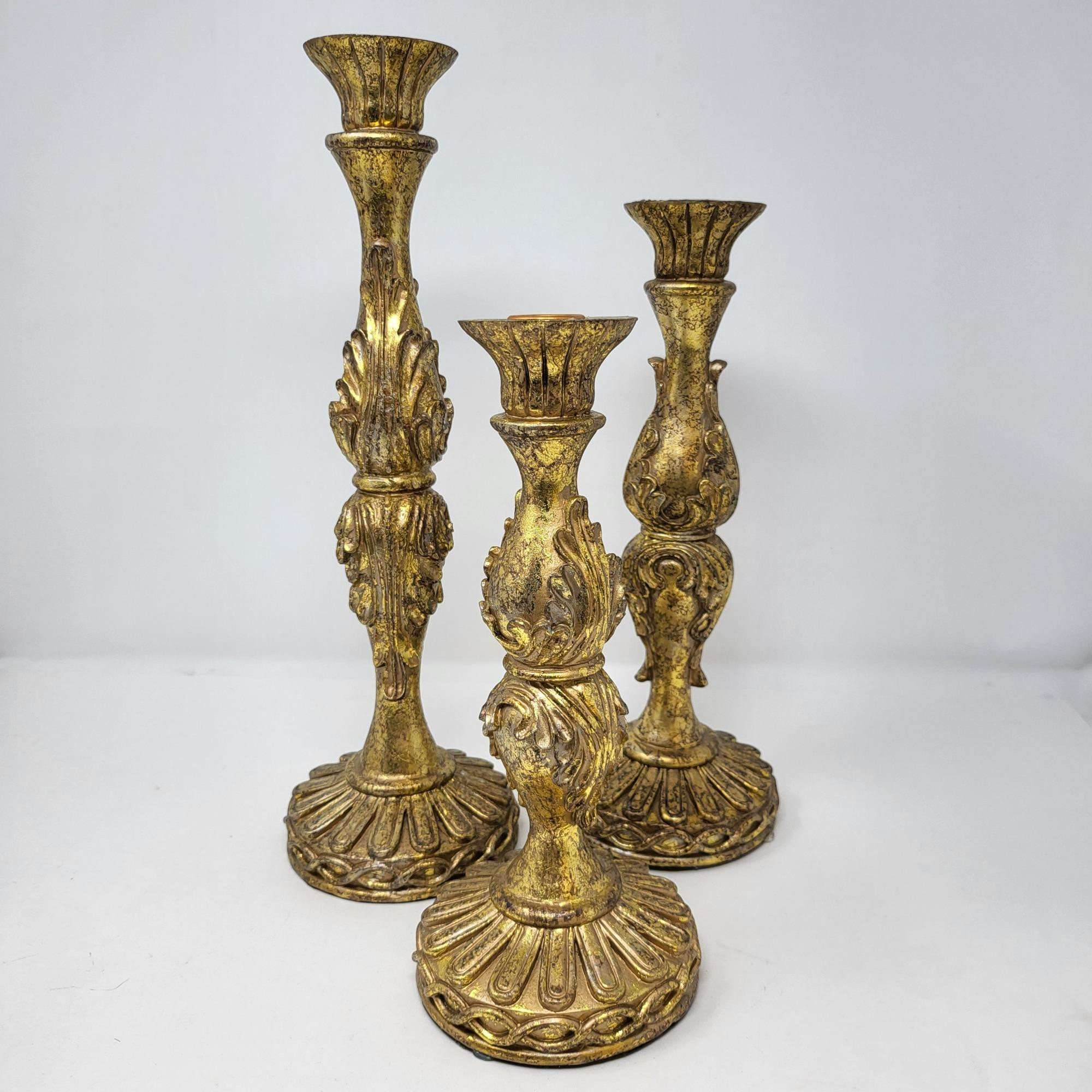 Vintage Bombay, detailed, column style, gold gilt candlestick holder trio. They measure 14", 12" and 10.5" tall. [DM]