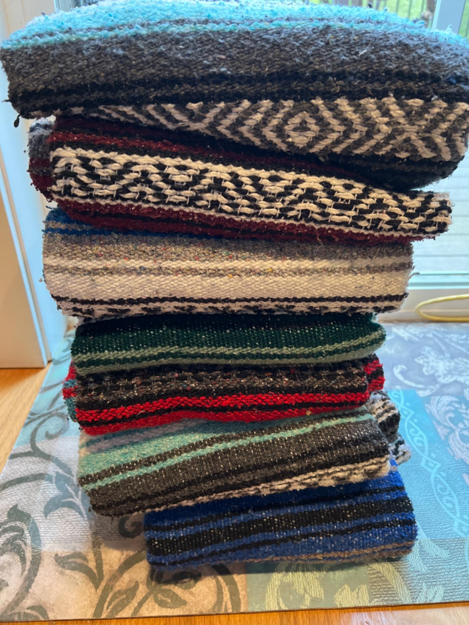 Seven traditional Mexican cozy blankets of different colors. Most blankets are approximately 44” wide and 53” long. [PA]