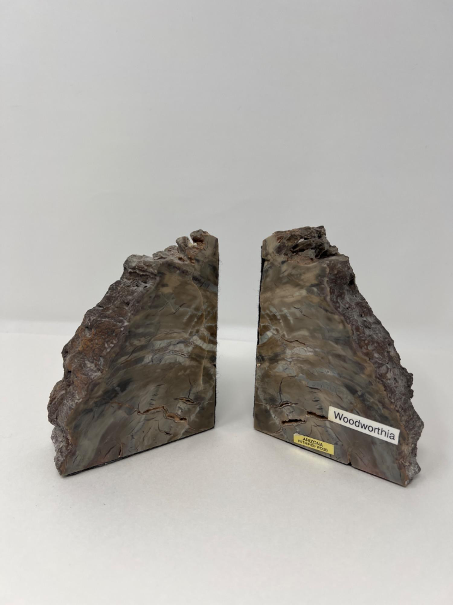 Bookends are solid petrified wood with felt attached on one flat short side and one flat long side. Marked from Arizona and a label that says, Woodworthia. 5" x 4" x 2" each.