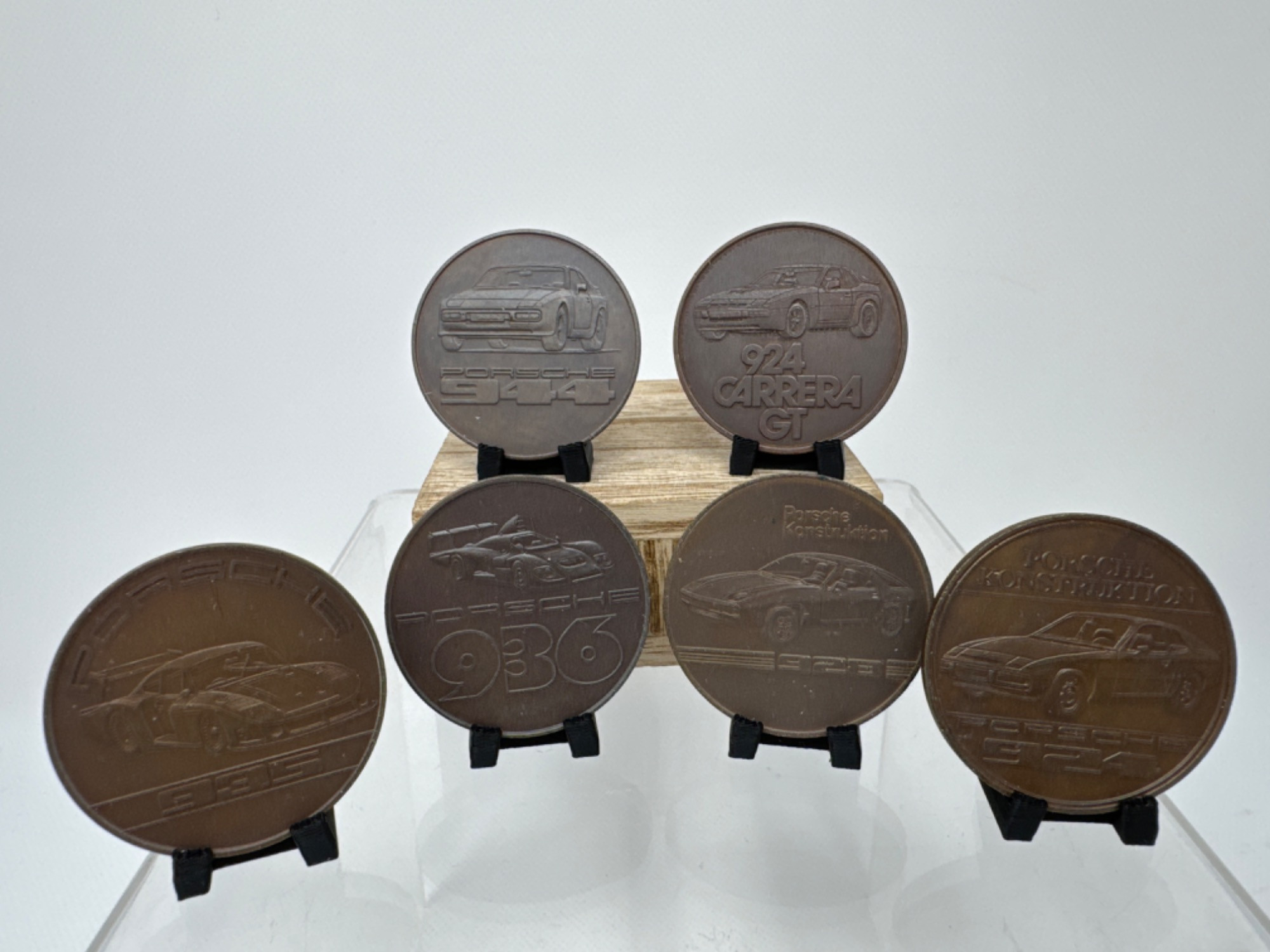 Porsche Calendar Coins - 1977, 1978, 1979, 1980, 1981, & 1982 No noted issues Measures: 1.5"D Stands are not included