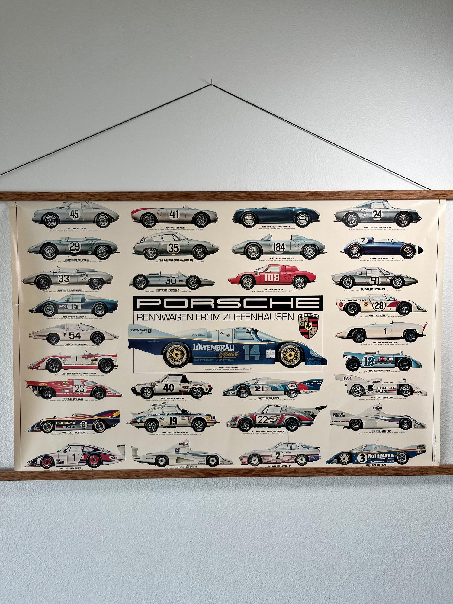 Quarterly Porsche Family Tree Race Cars poster, Artwork by Ken Rush. Shows Porsche race cars