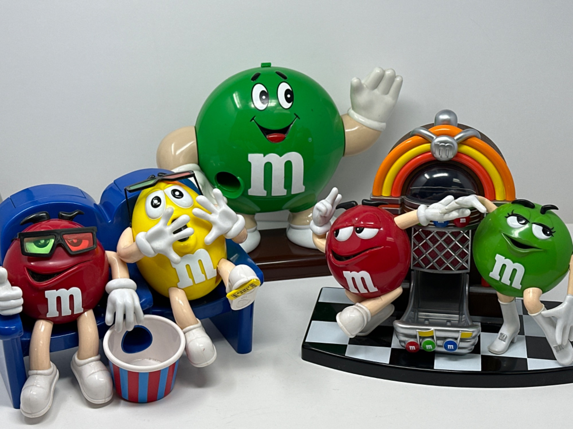 9-10” W x 6-9” H Circa 1992 M&M figures sitting on the couch with the popcorn bucket 1992 green M&M dispenser 1990's M&M jukebox dispenser These are all untested