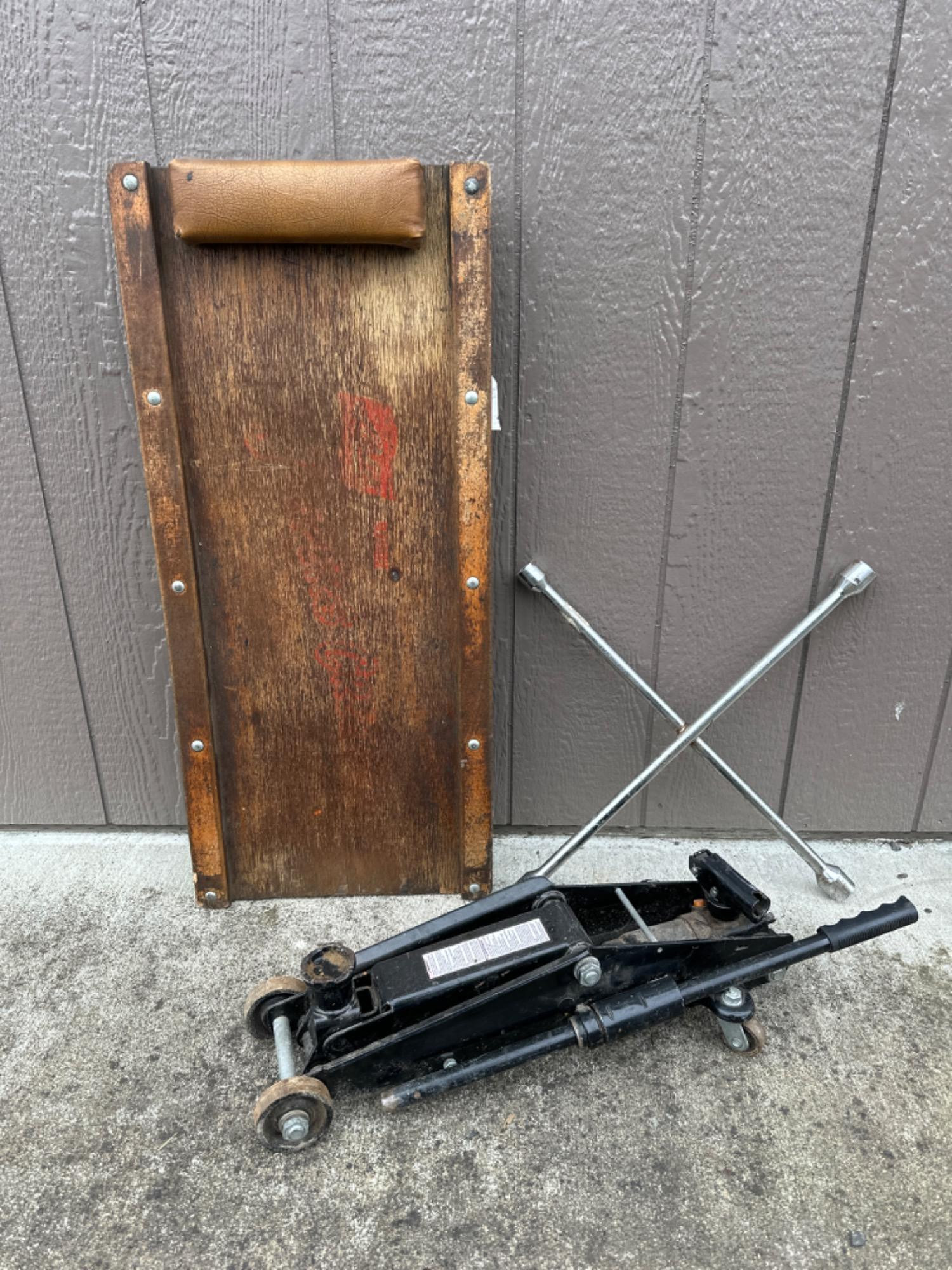 The vintage wooden creeper measures 16 inches wide by 36 inches long Floor jack is central pnuematic 2 1/2 ton