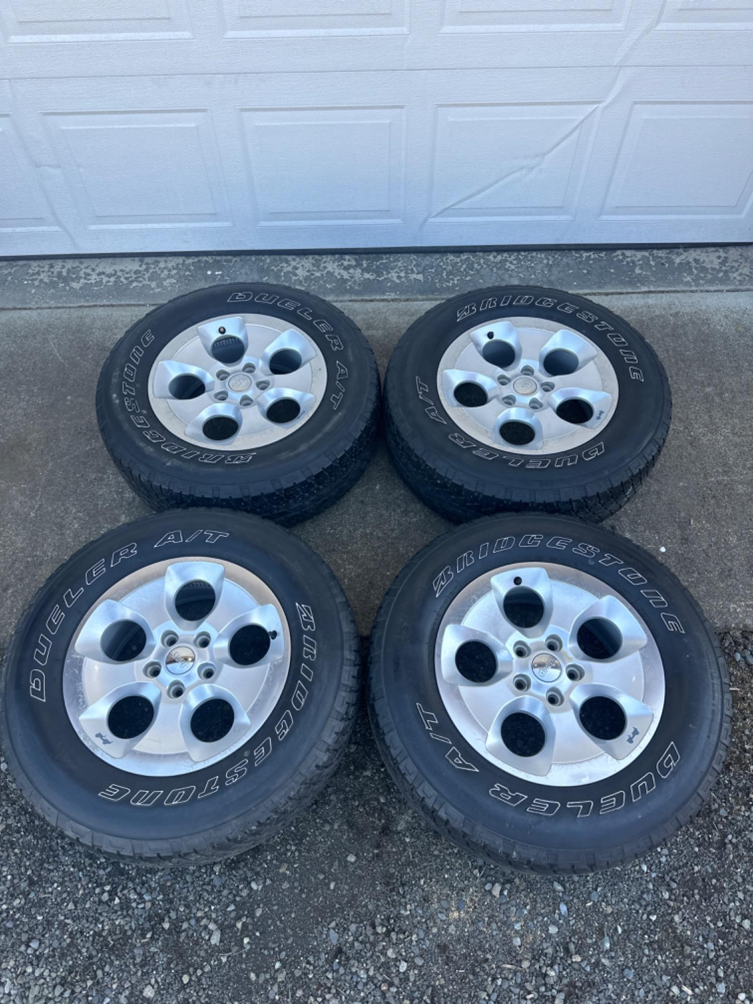 Set of Jeep Wrangler wheels 255 70 R 18 tires have about 50% tread left