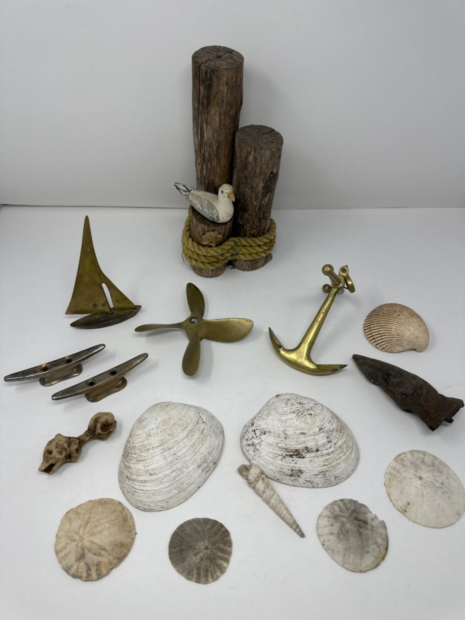 Solid brass boat anchor measure 5 inches tall 6 inches wide Solid brass propeller measures 5 1/4 inches wide 1 and 1/8 inch deep solid brass sailboat meters 5 1/2 inches tall 3 1/2 inches long 1 inch deep Sand dollars are 2 3/4 inches and smaller Tie offs are 4 inches long 1 inch high 3/4 inch deep