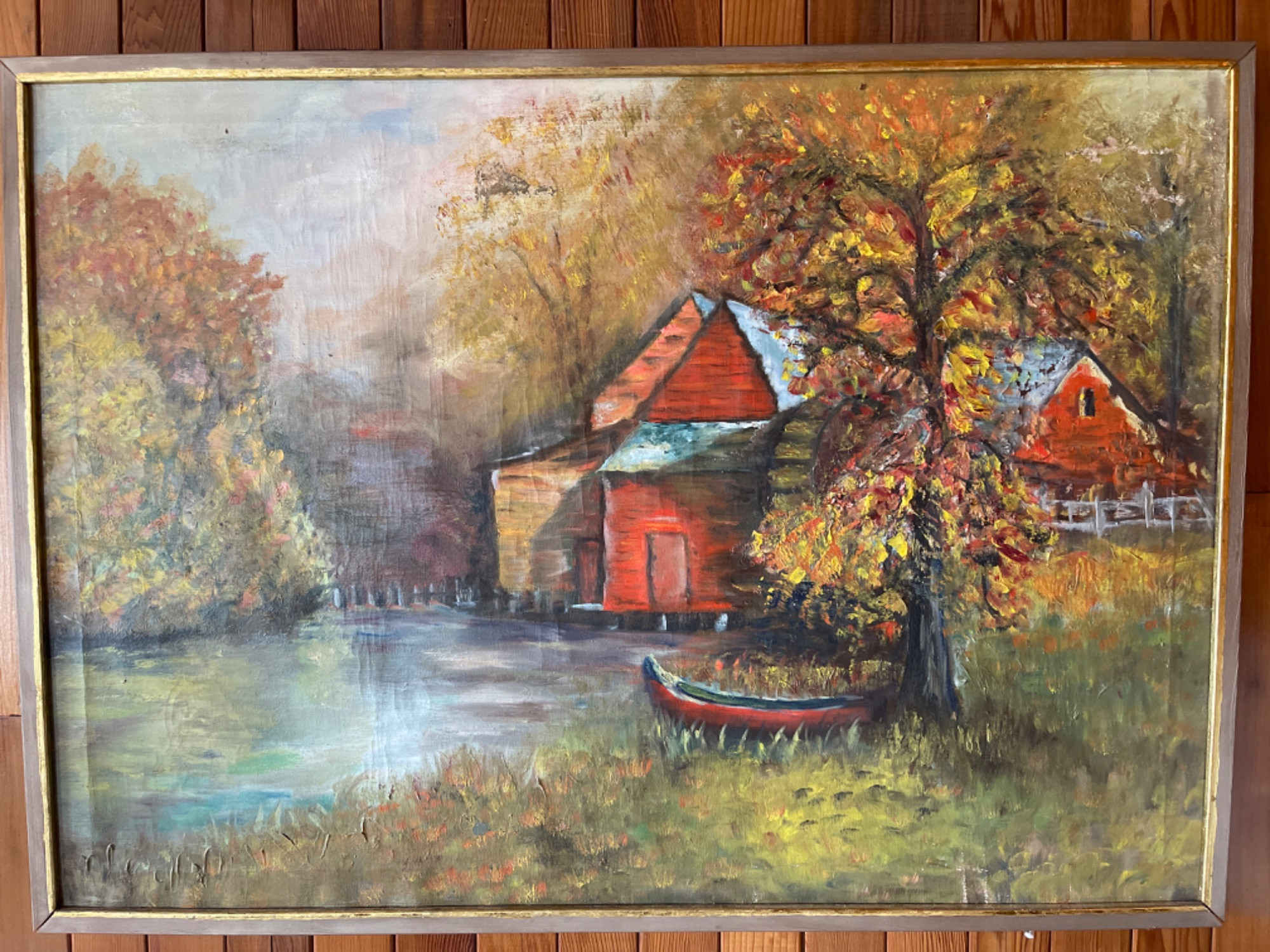 Unknown Artist The piece does have some creasing throughout painting. Shown in photos as well as possible. Frame is old but holding together. Measurements: 35 inches x 26 inches