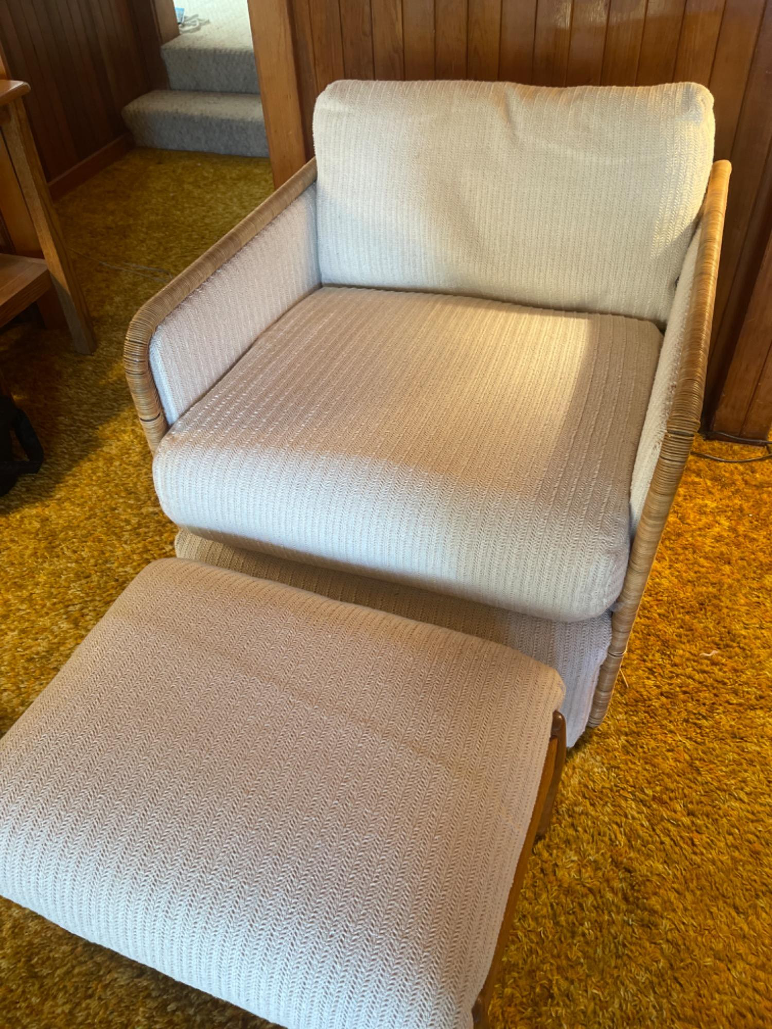 Chair is in great condition with only minor stains and snags. Measurements: 29 inches x 36 inches x 25 inches Ottoman: 25 inches x 16 inches x 16 inches Bidding on this lot is an agreement that: (1.) You