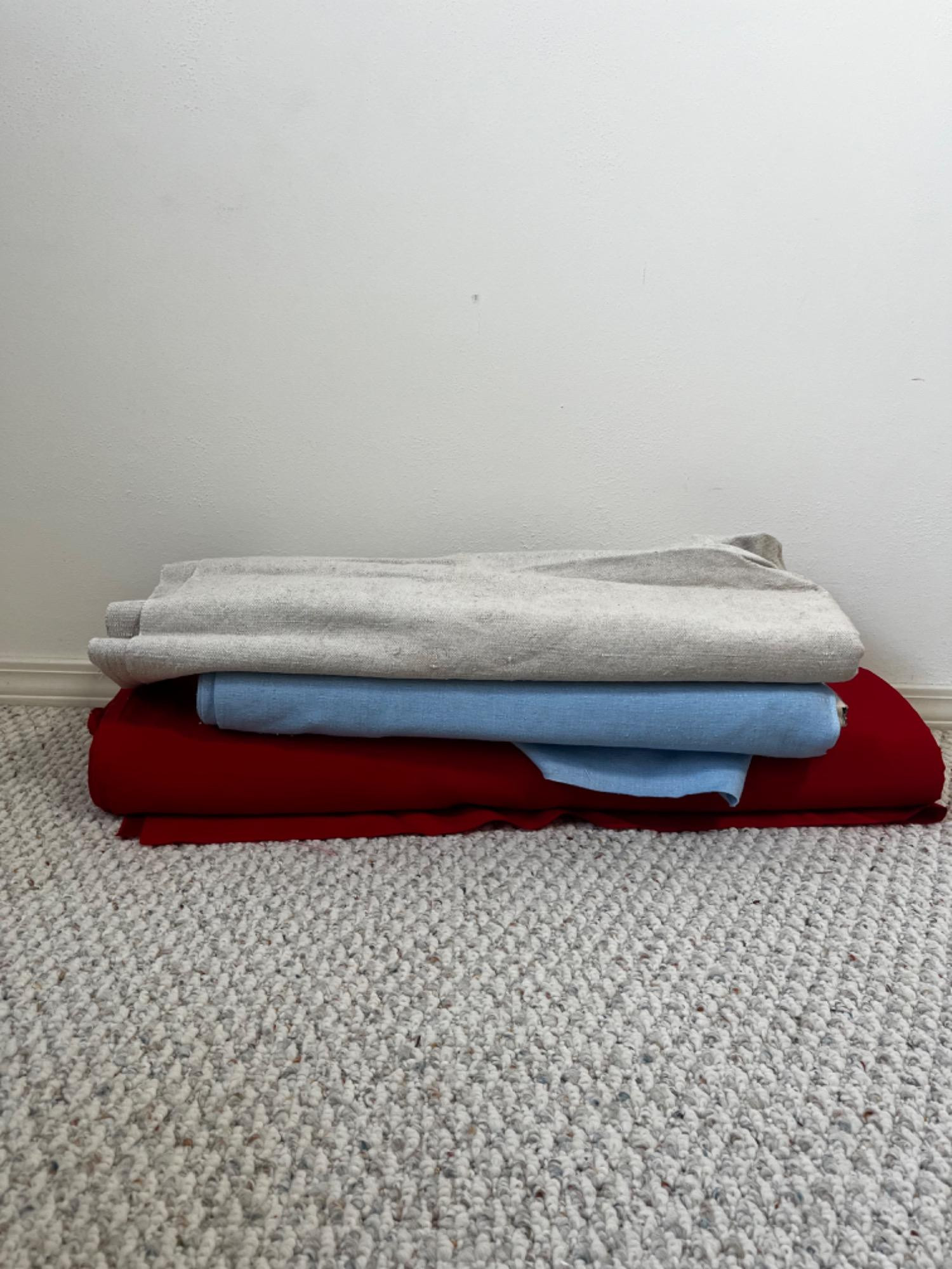 Red: Looks to be nearly full roll of fabric in good condition with no damage. Blue: Maybe half or little less left. Some snags on the piece on top but under it looks to be in good condition. Grey: Little bit of fabric left with snags and needs cleaning.
