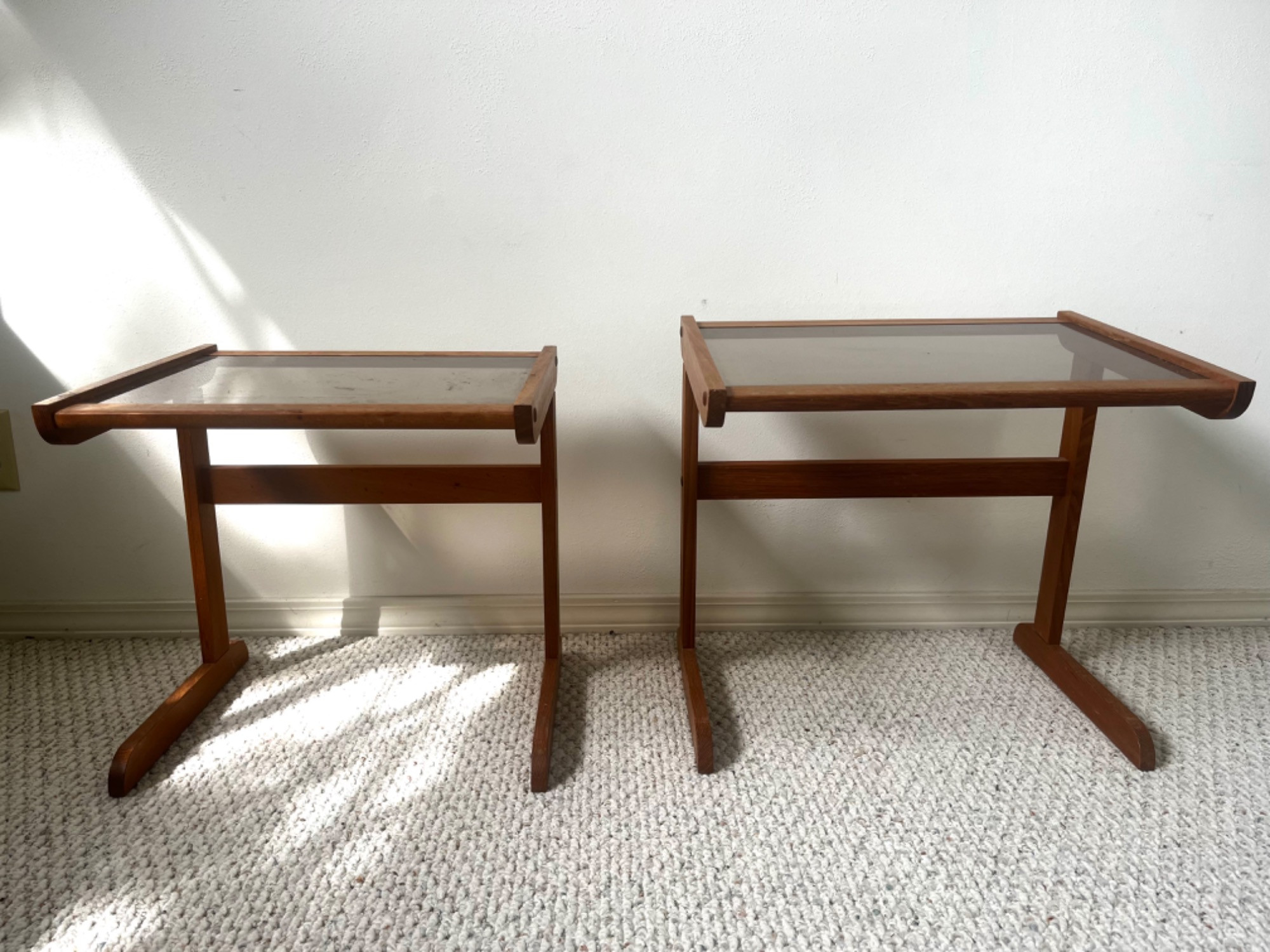 Table 1:14.75 inches x 17.75 inches x 17 inches Table 2: 19.5 inches x 14.75 inches x 18.5 inches Both have numerous stains on both wood and glass. Glass also has some scratches.